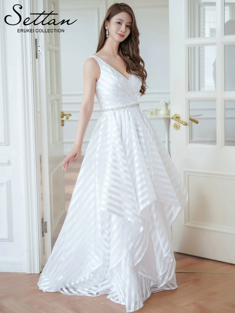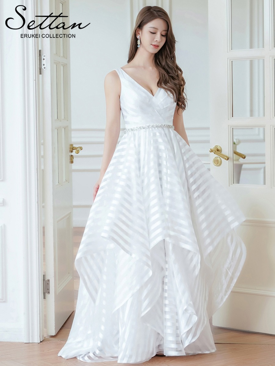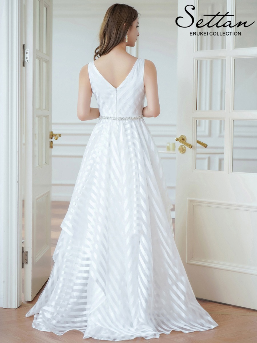 [ERUKEI/SETTAN]ホワイト・ノースリーブ・Vネック・ストライプ・ビジュー・変形ヘム・フレア・Aライン・ロングドレス[送料無料] [lk-s36102]