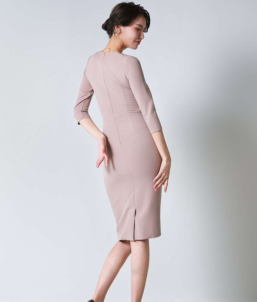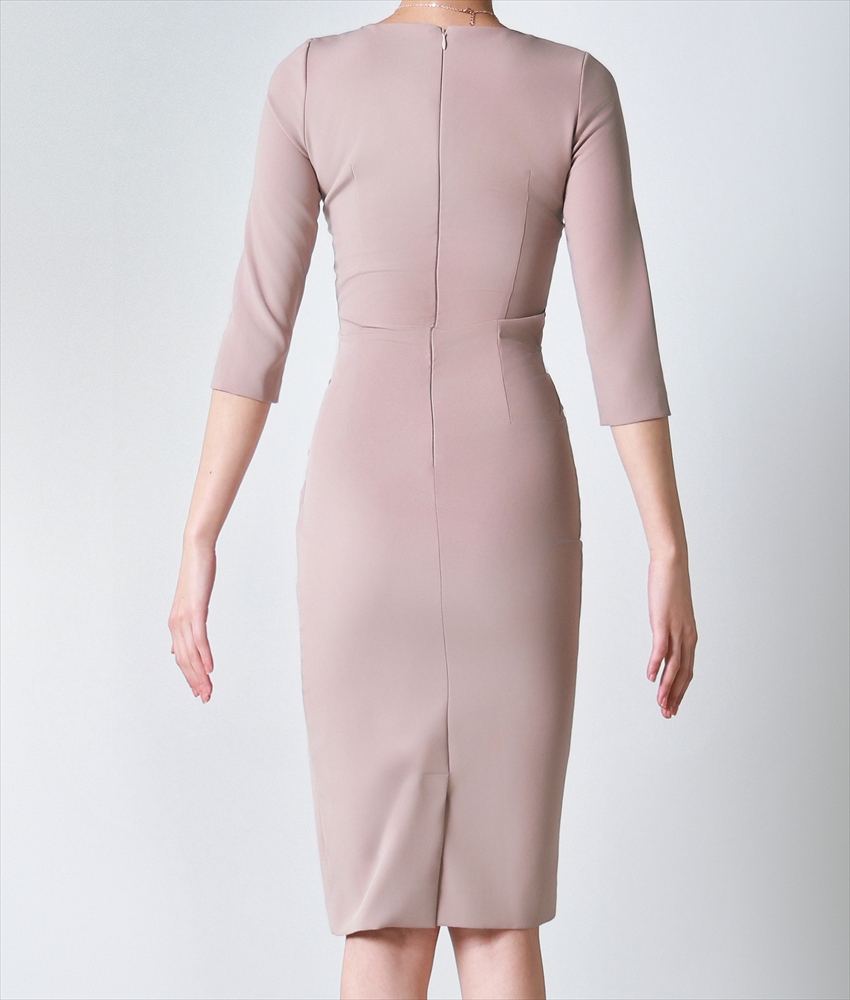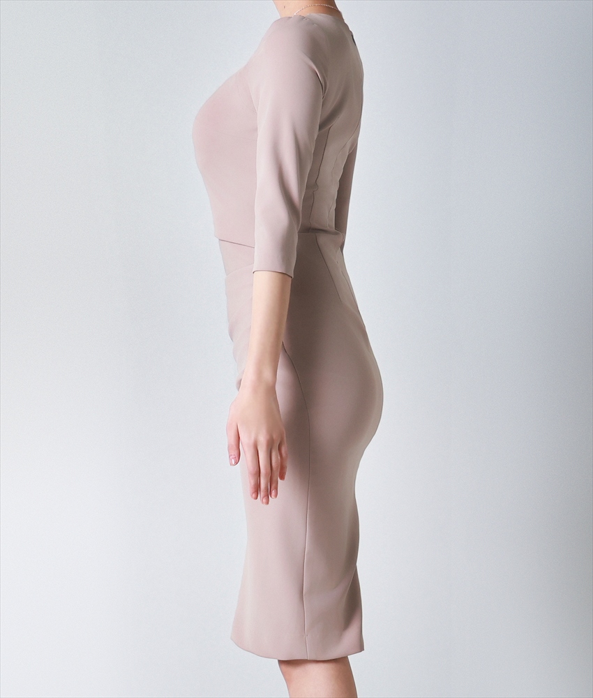 [韓国製][rinfarre]ベージュ・七分袖・トライアングルカット・タイト・ミディアムドレス・ワンピース[奈月セナ着用][送料無料] [cd-k06247gr]