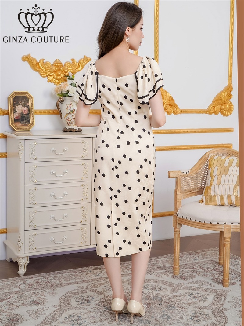 [ERUKEI/GINZA COUTURE]サテンジャガード・花柄・ドット・プリント・フリルスリーブ・パイピング・ビーズ・ラインストーン・タイト・ミディアムドレス・ワンピース[送料無料] [lk-c2863]