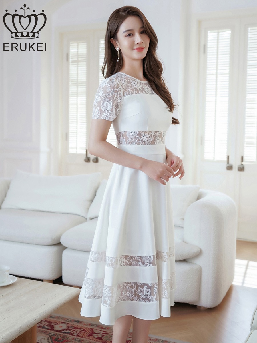 [ERUKEI]ホワイト・ブラック・総レース・半袖・Aライン・上品・ひざ下・ミディアムドレス・ワンピース[送料無料] [lk-e22138]