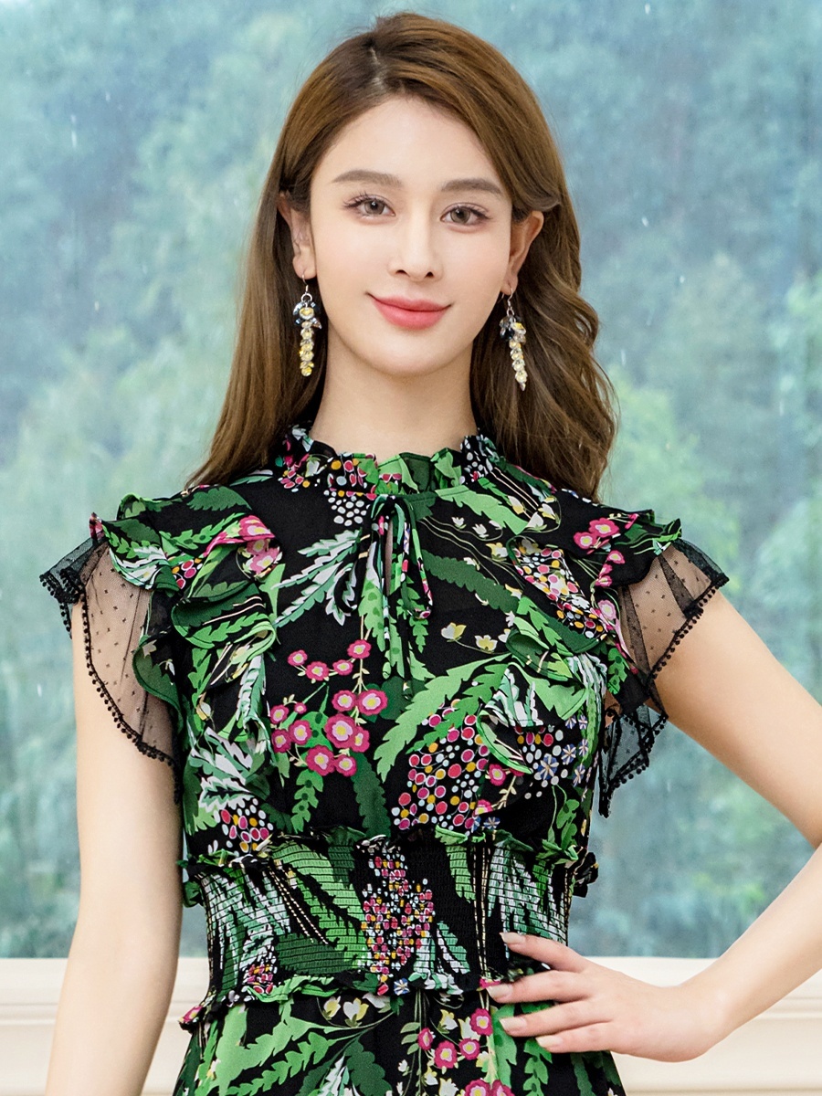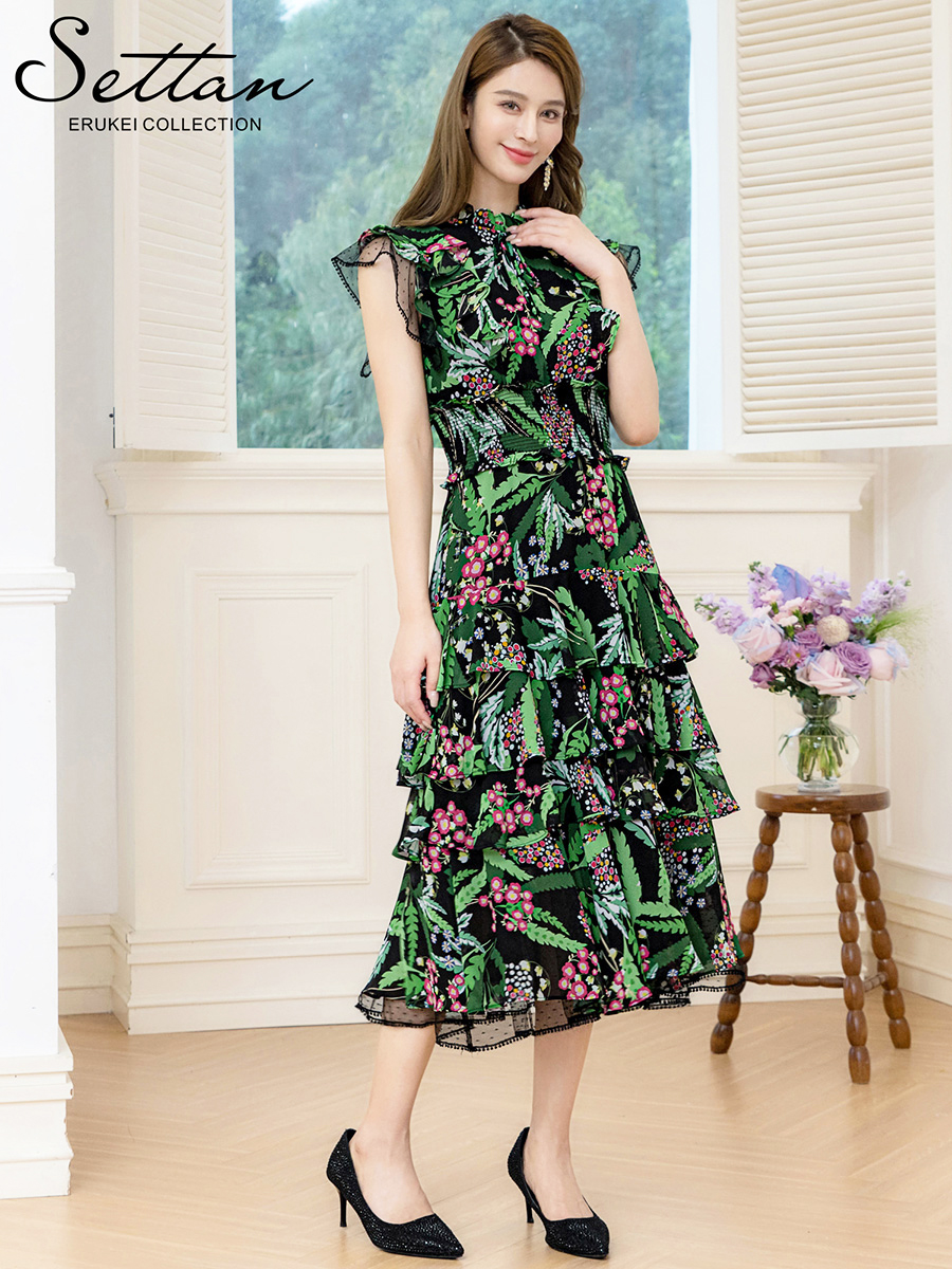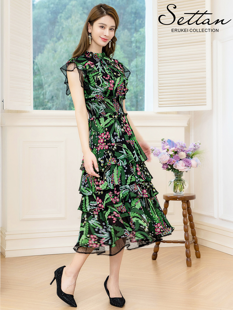 [ERUKEI]ブラック×グリーン・花柄・ティアードフリル・Aライン・レースポイント・ミディアムドレス・ワンピース[送料無料]