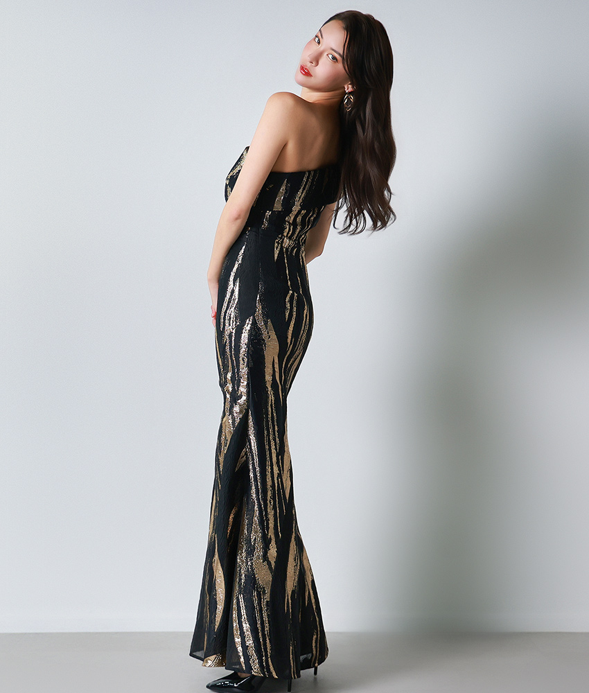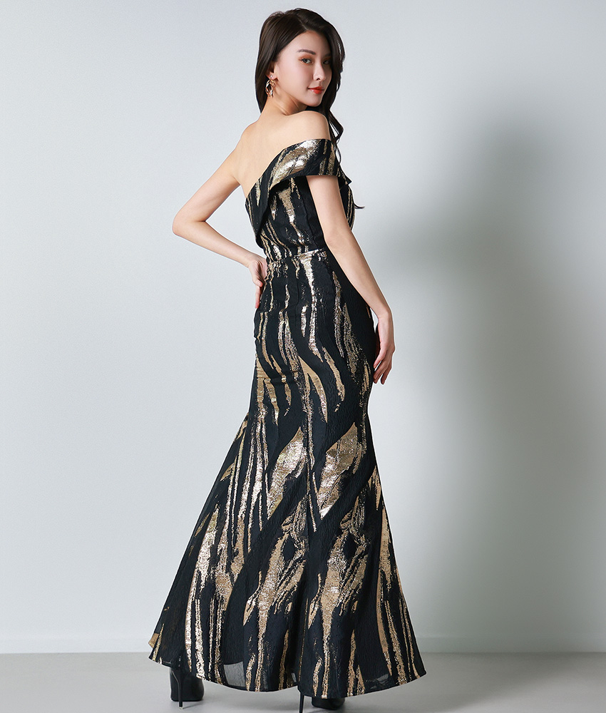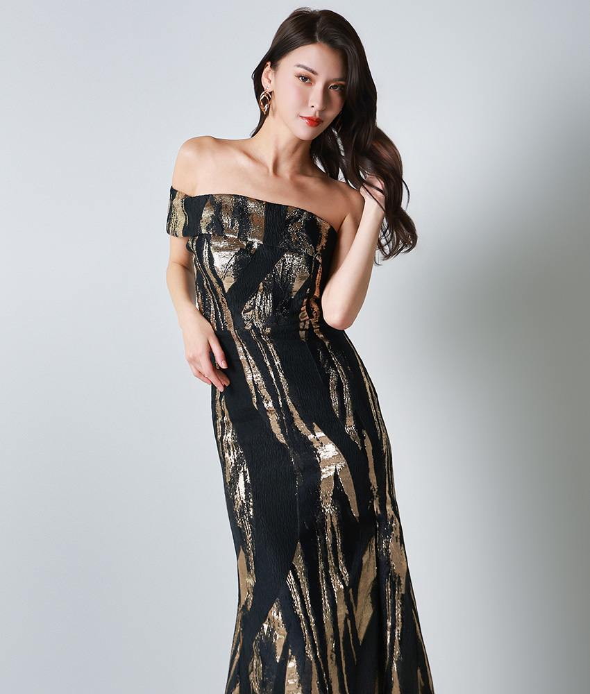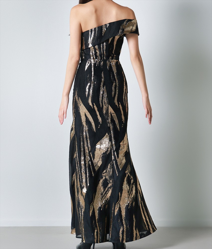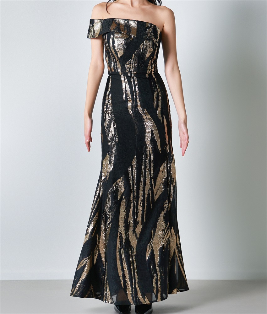 [ERUKEI]オフショルダー・ワンショルダー・ブラック×ゴールド・セクシー・エレガント・Aライン・ロングドレス[奈月セナ着用][送料無料] [lk-s25325]