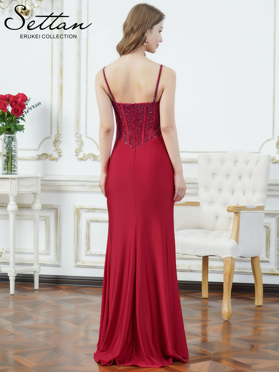 [ERUKEI/SETTAN]ラインストーン・シアー・ストレッチ・サテン・キャミソール・ギャザー・スリット・タイト・マーメイド・ロングドレス[送料無料]