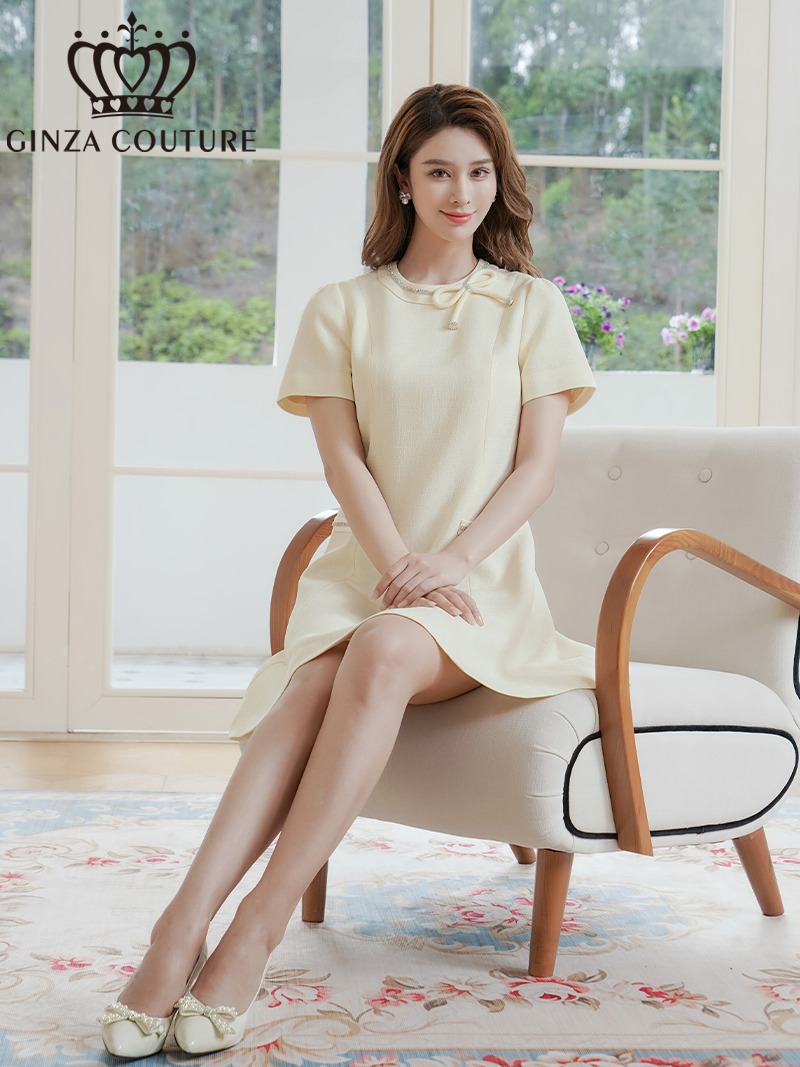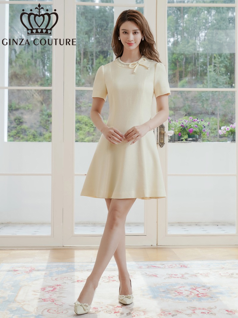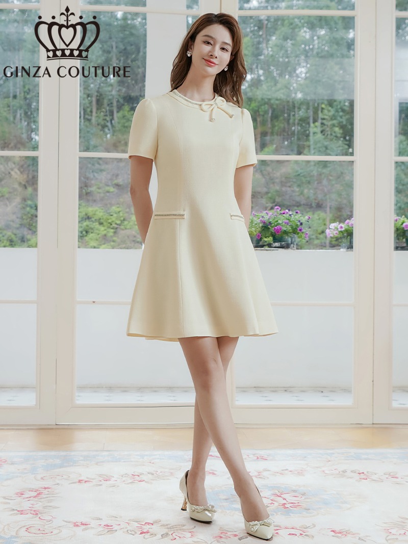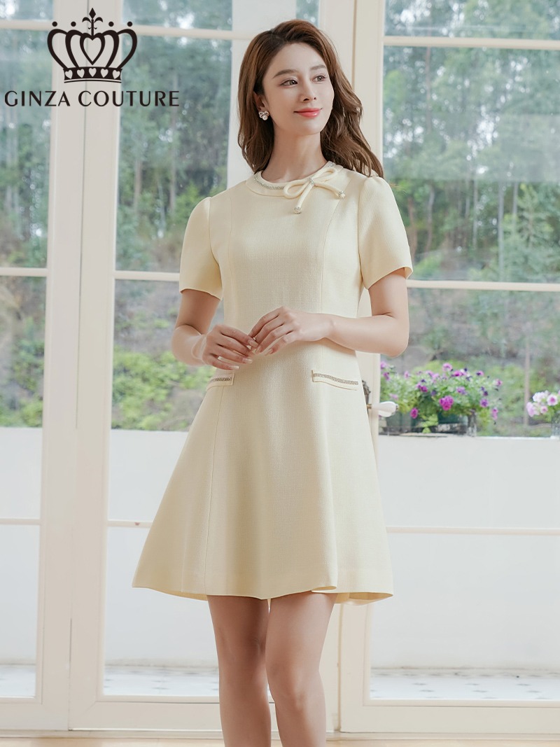 [ERUKEI/GINZA COUTURE]アイボリー・リボン・半袖・ラインストーン・フェイクポケット・Aライン・ミニドレス・ワンピース[送料無料] [lk-c37301]