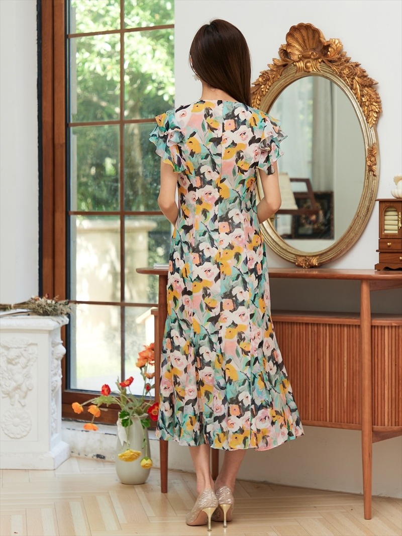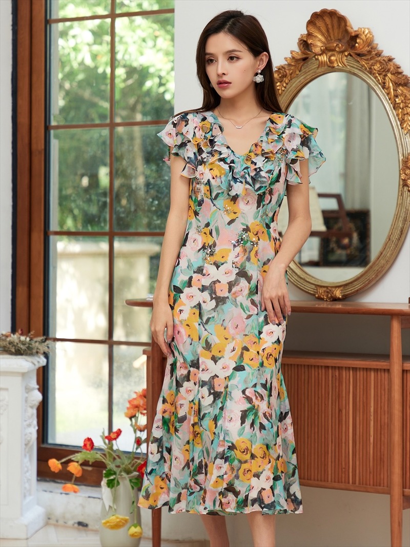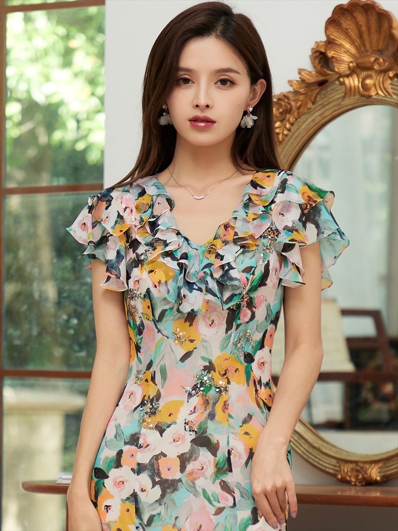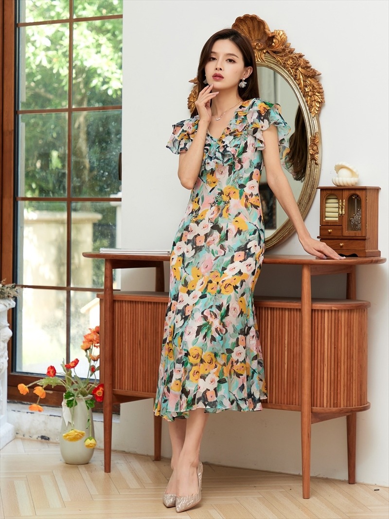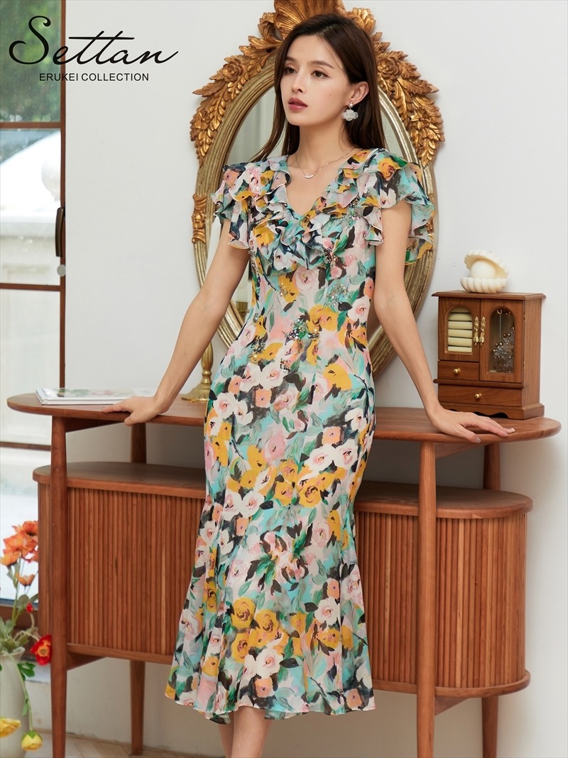 [ERUKEI/SETTAN]プリント・花柄・スパンコール・Vネック・マーメイドライン・ミディアムドレス・ワンピース[送料無料]