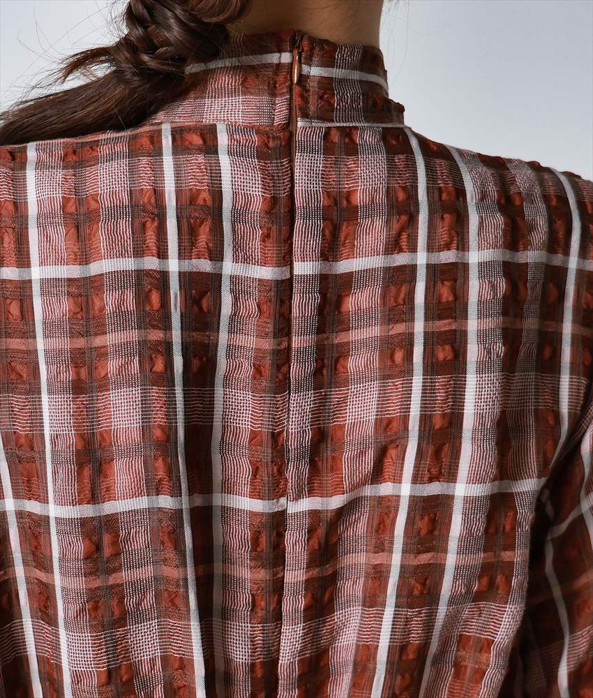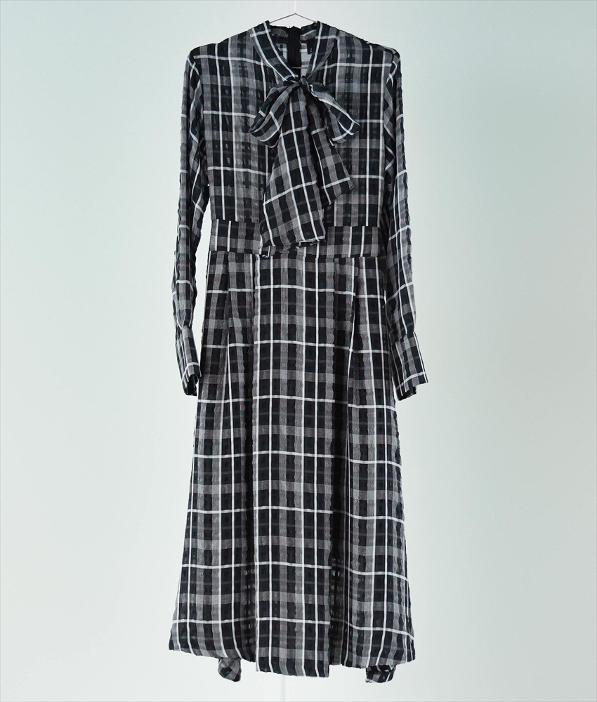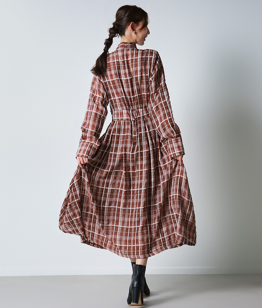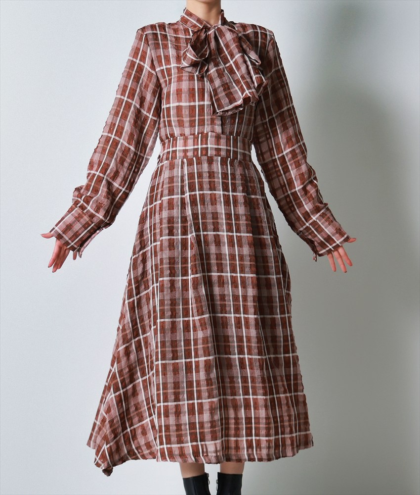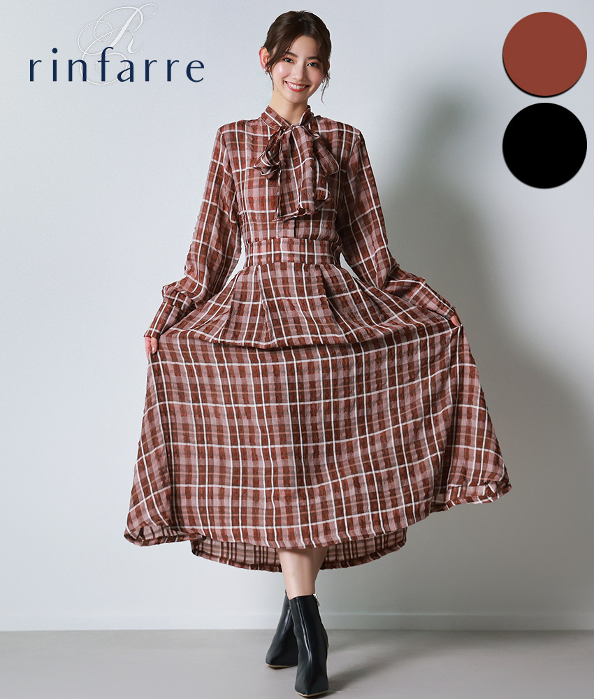 [韓国製][rinfarre]チェック柄・長袖・リボンタイ・Aライン・ブラウン・ブラック・フレア・ロング・ひざ下・ワンピース・ドレス[黒木麗奈着用][送料無料]