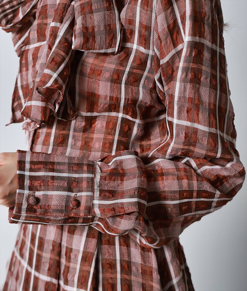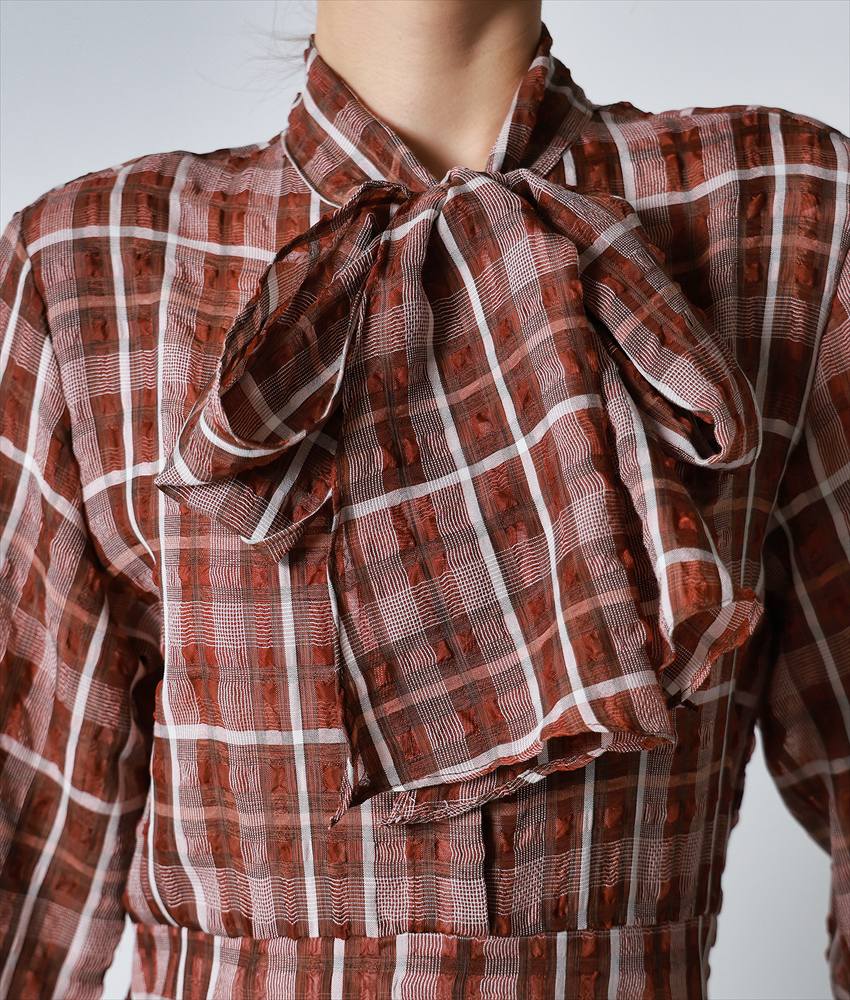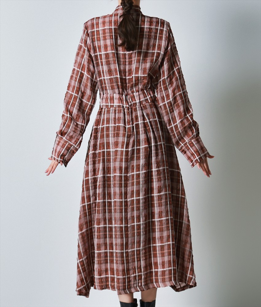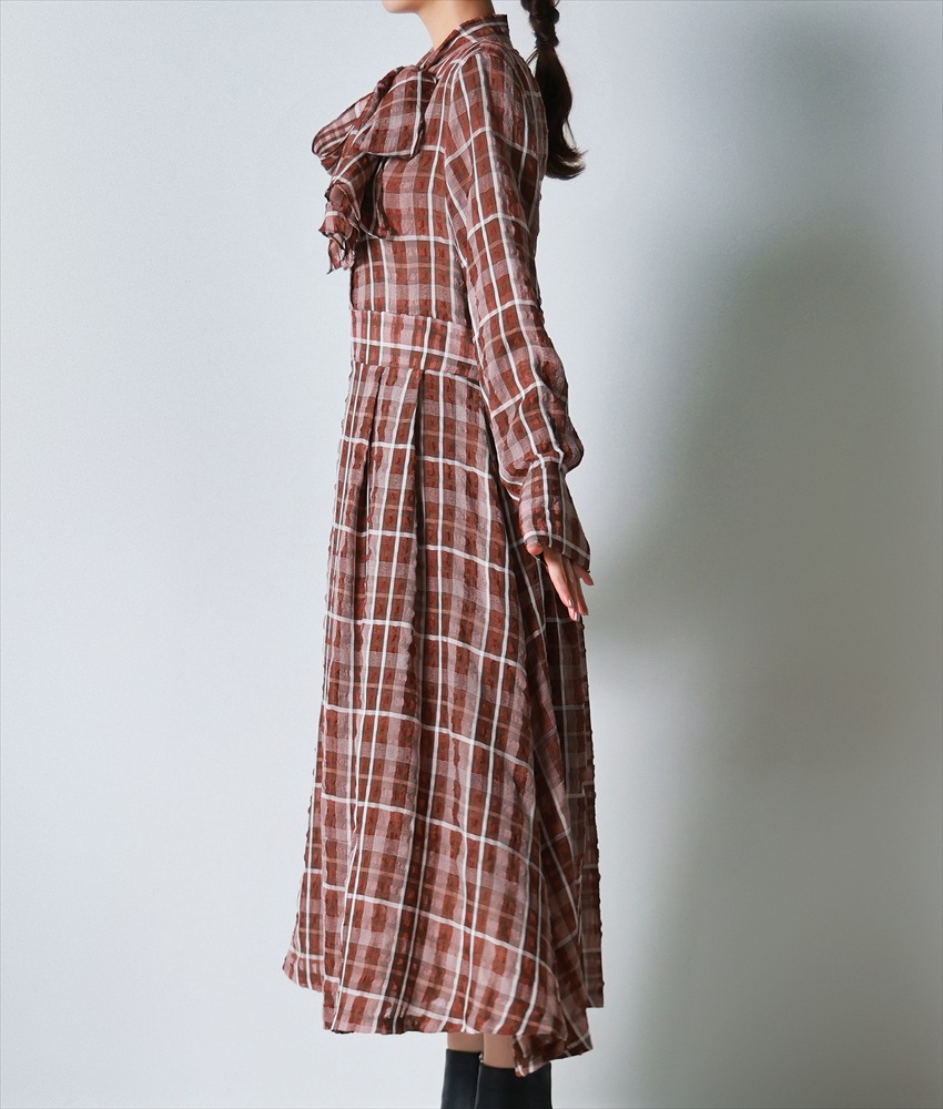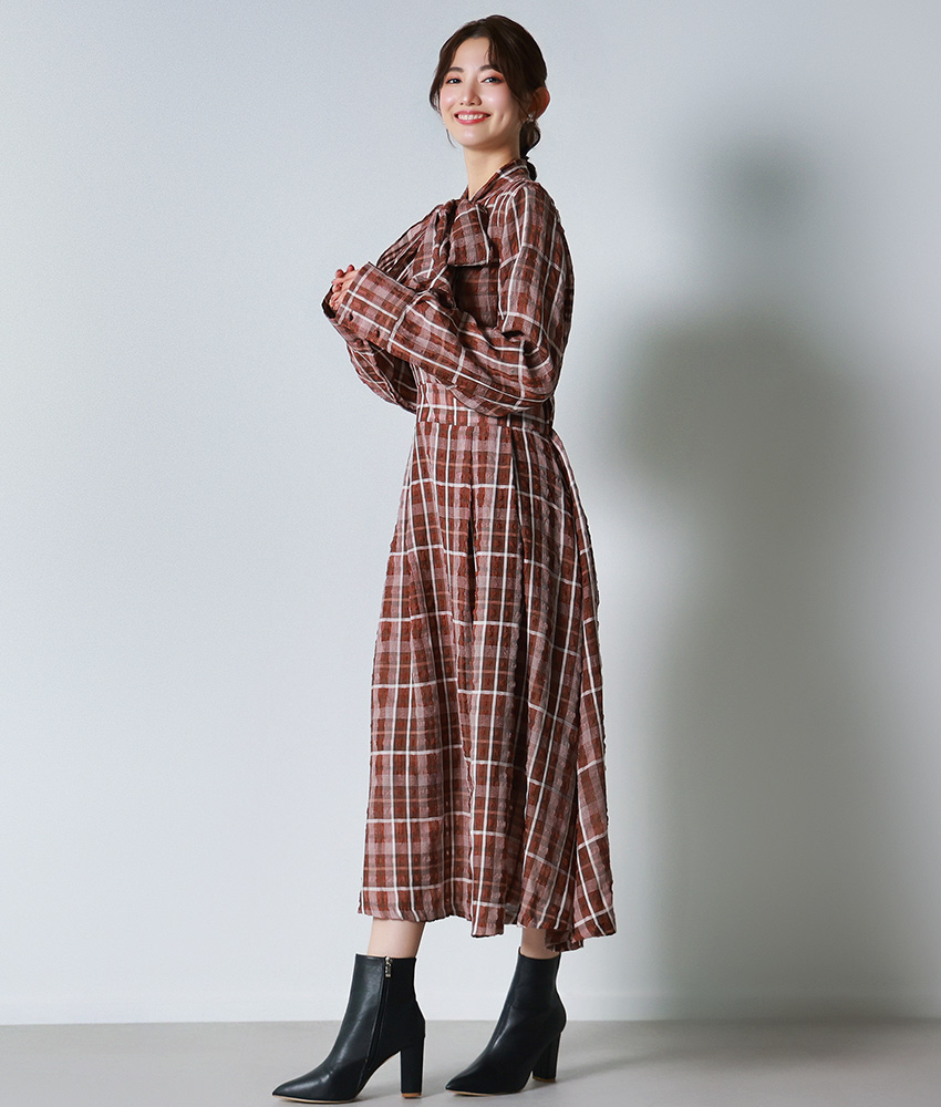 [韓国製][rinfarre]チェック柄・長袖・リボンタイ・Aライン・ブラウン・ブラック・フレア・ロング・ひざ下・ワンピース・ドレス[黒木麗奈着用][送料無料] [cd-k06221ia]