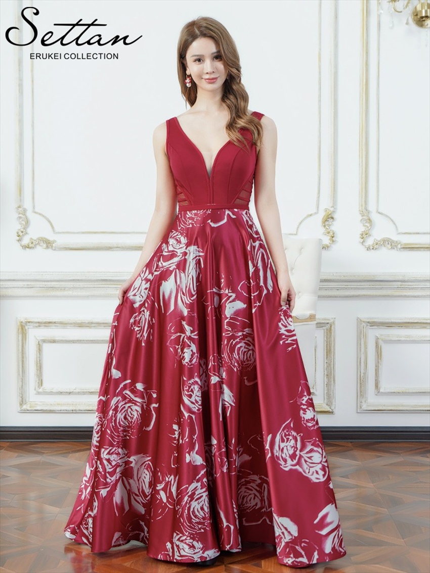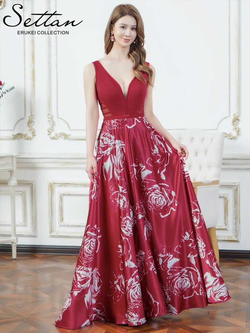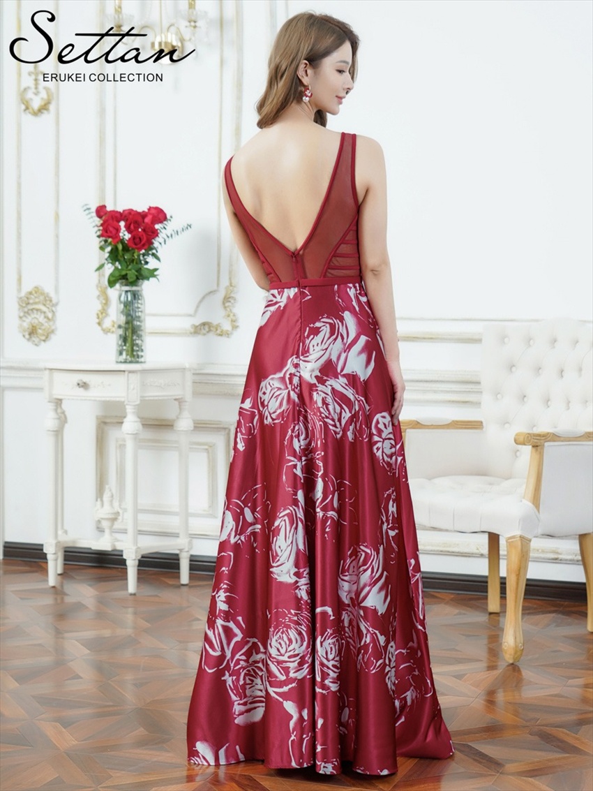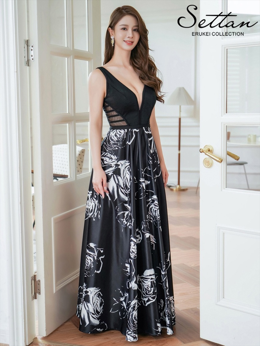 [ERUKEI/SETTAN]薔薇・花柄・プリント・サテン・セクシー・シースルー・Aライン・ロングドレス[送料無料]