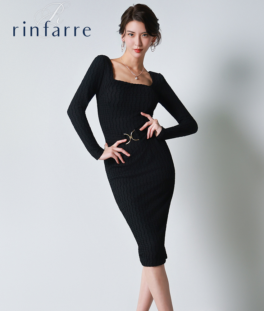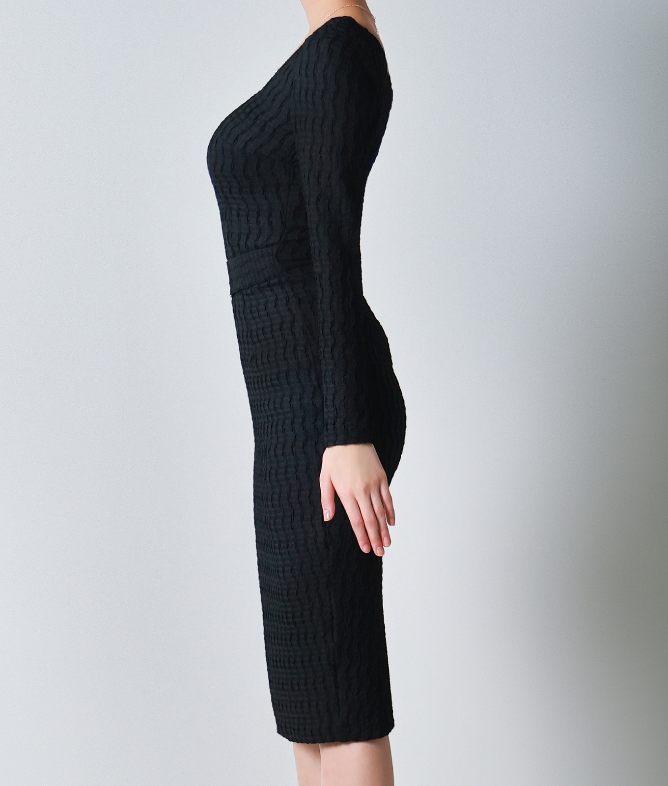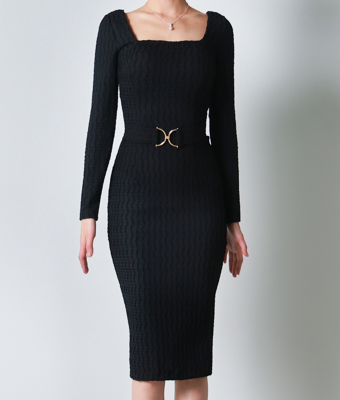 [韓国製][rinfarre]ブラック・長袖・凹凸ジャカード・ベルトデザイン・スクエアネック・タイト・ミディアムドレス・ワンピース[奈月セナ着用][送料無料]