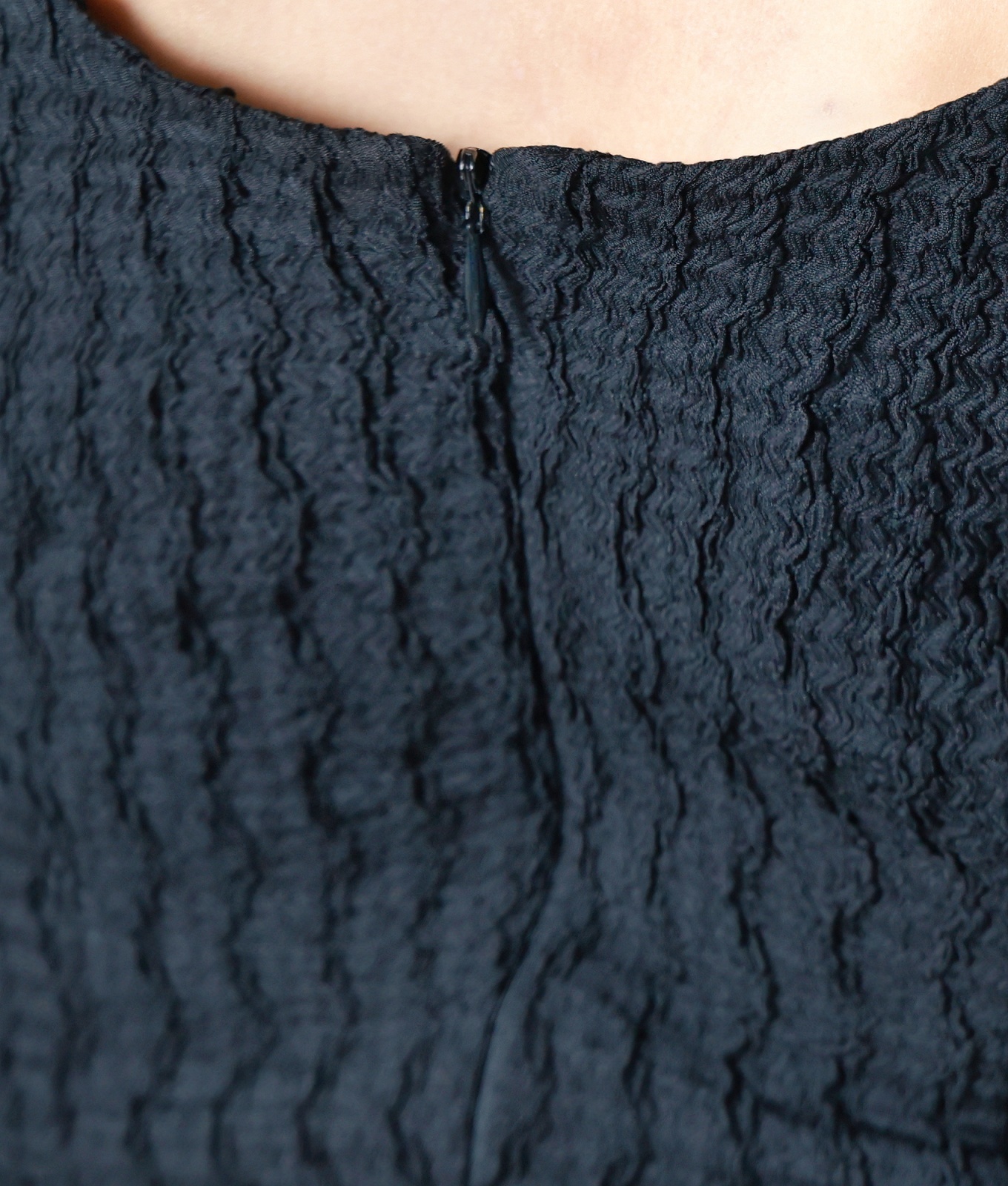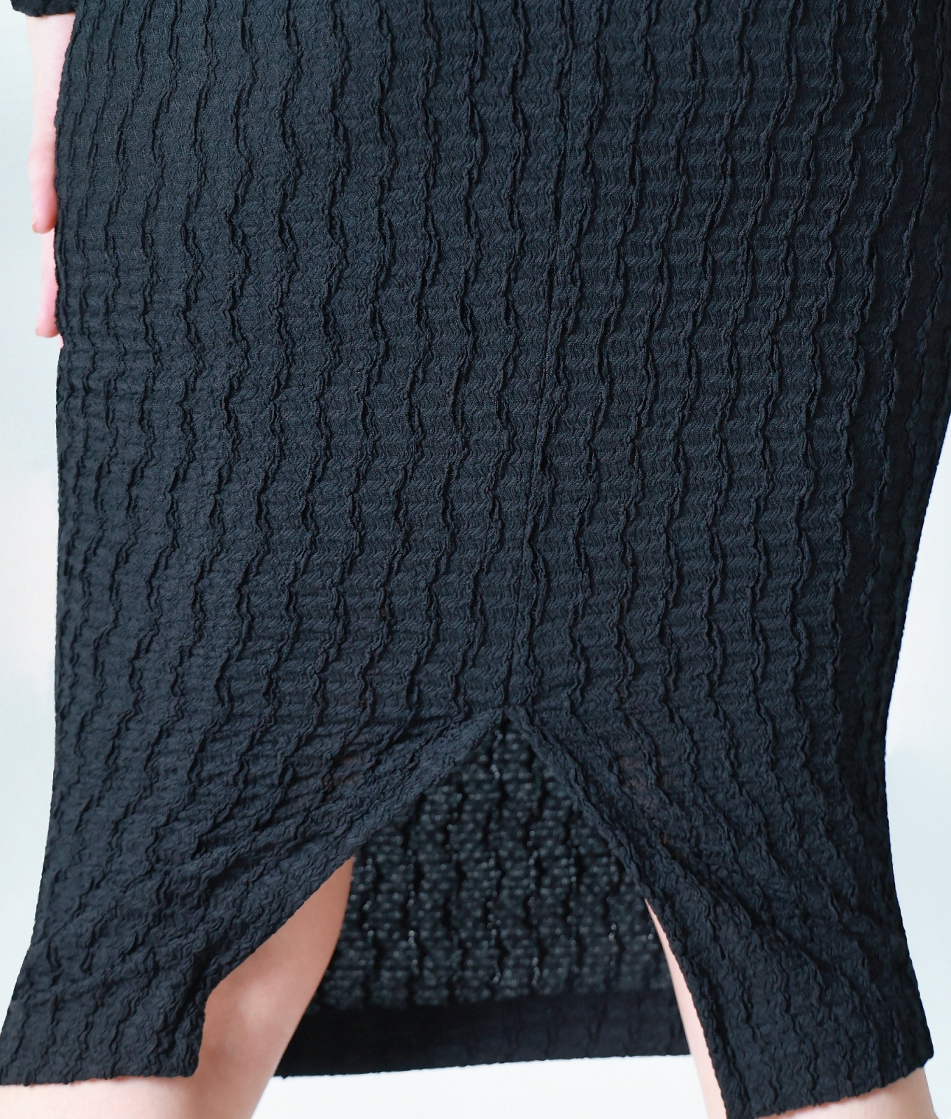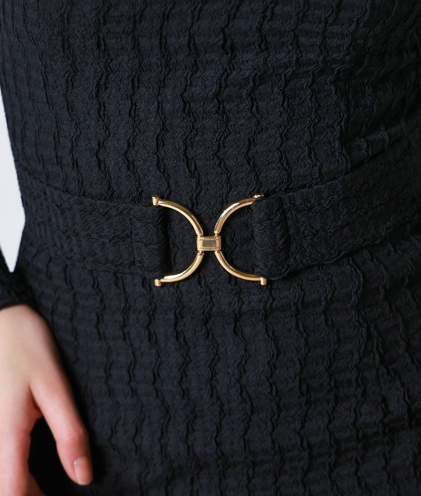 [韓国製][rinfarre]ブラック・長袖・凹凸ジャカード・ベルトデザイン・スクエアネック・タイト・ミディアムドレス・ワンピース[奈月セナ着用][送料無料]