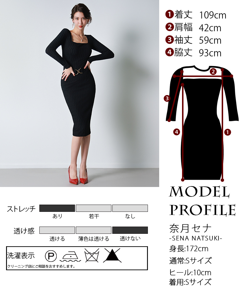 [韓国製][rinfarre]ブラック・長袖・凹凸ジャカード・ベルトデザイン・スクエアネック・タイト・ミディアムドレス・ワンピース[奈月セナ着用][送料無料] [cd-k06259rd]