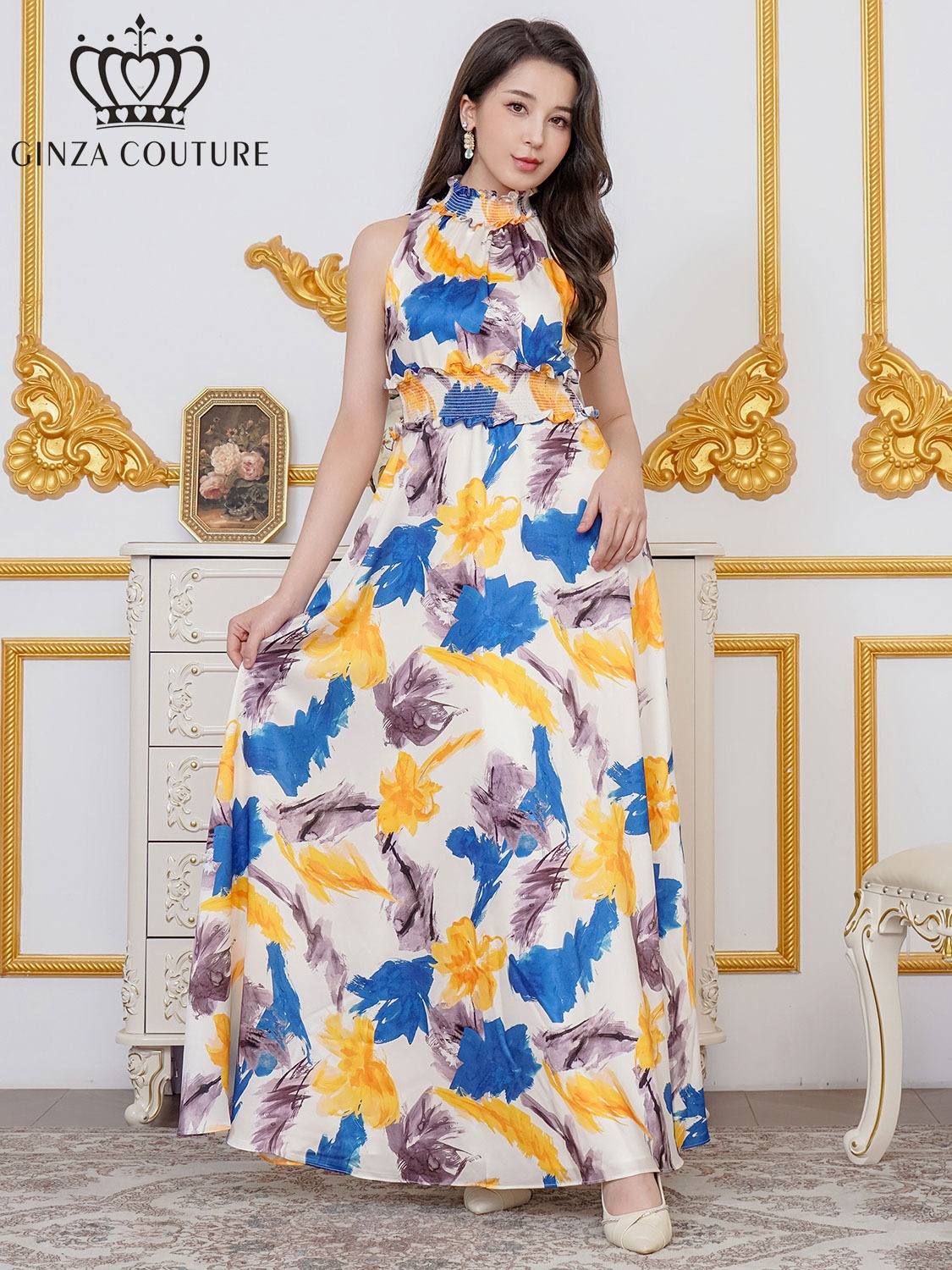 [ERUKEI/GINZA COUTURE]ペイント柄・プリント・サテン・首元フリル・ウエストマーク・アメリカンスリーブ・マキシ・Aライン・ロングドレス[送料無料] [lk-c34165]
