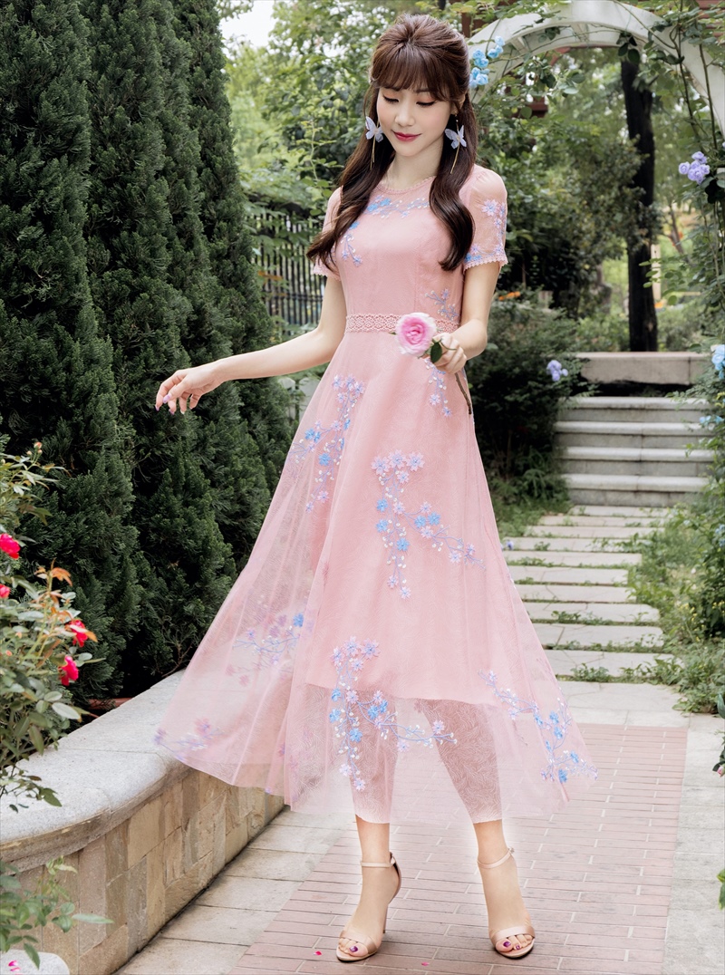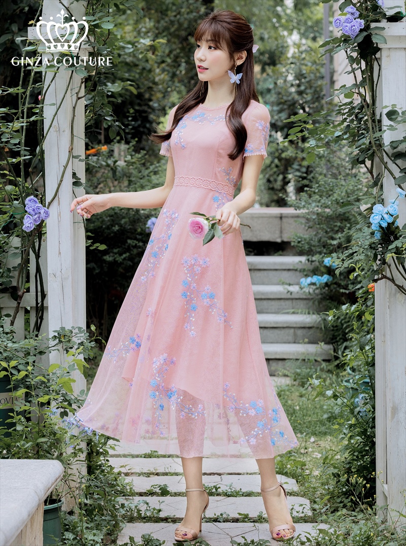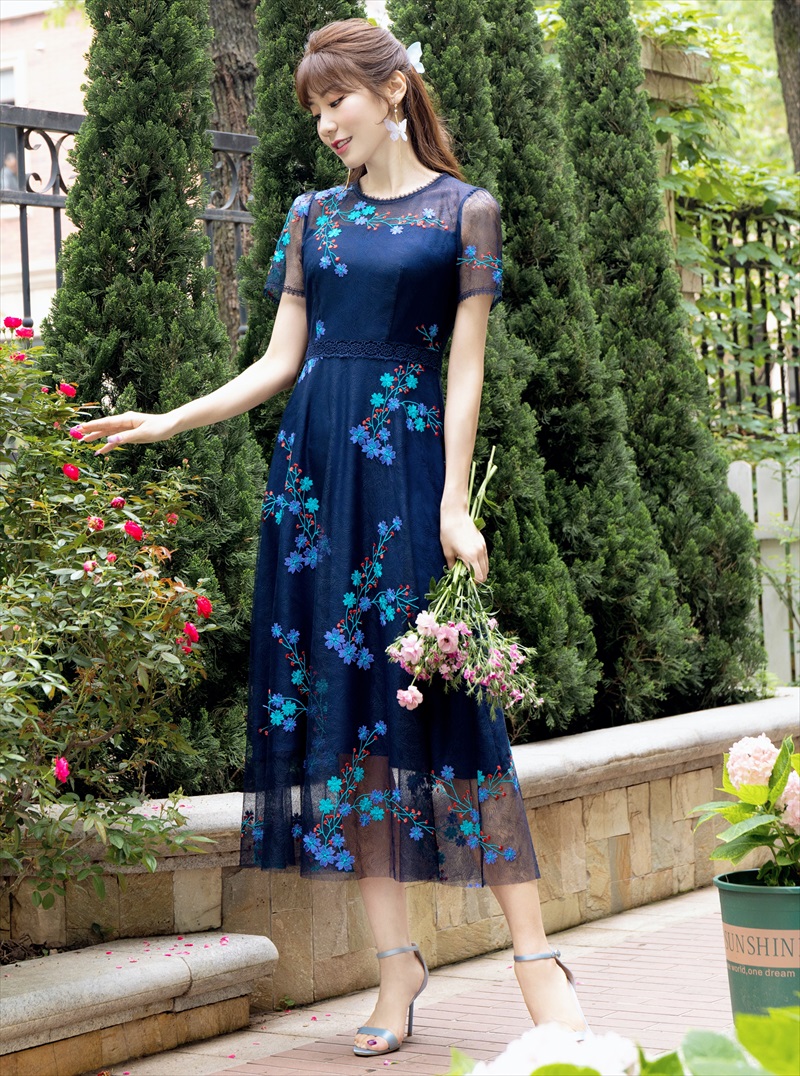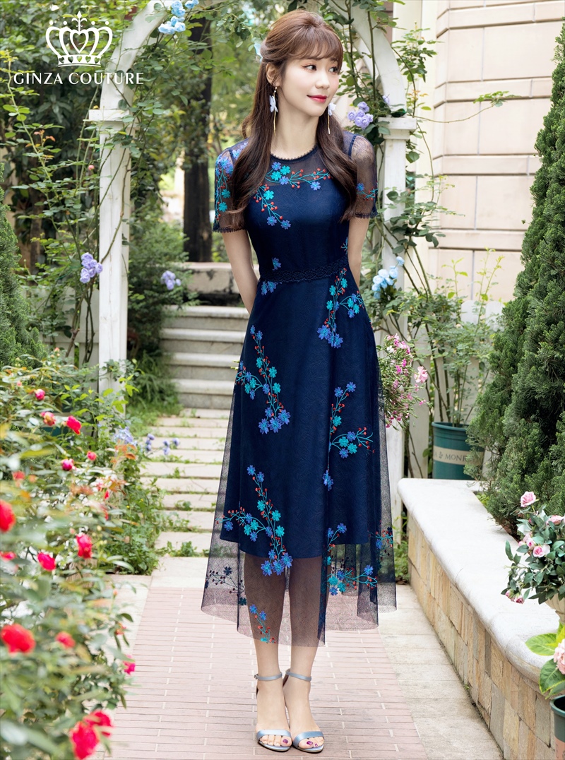 [ERUKEI/GINZA COUTUR]ピンク・ネイビー・Aライン・フワラーモチーフ・総レース・ミディアムドレス・ワンピース[送料無料] [lk-c2659]