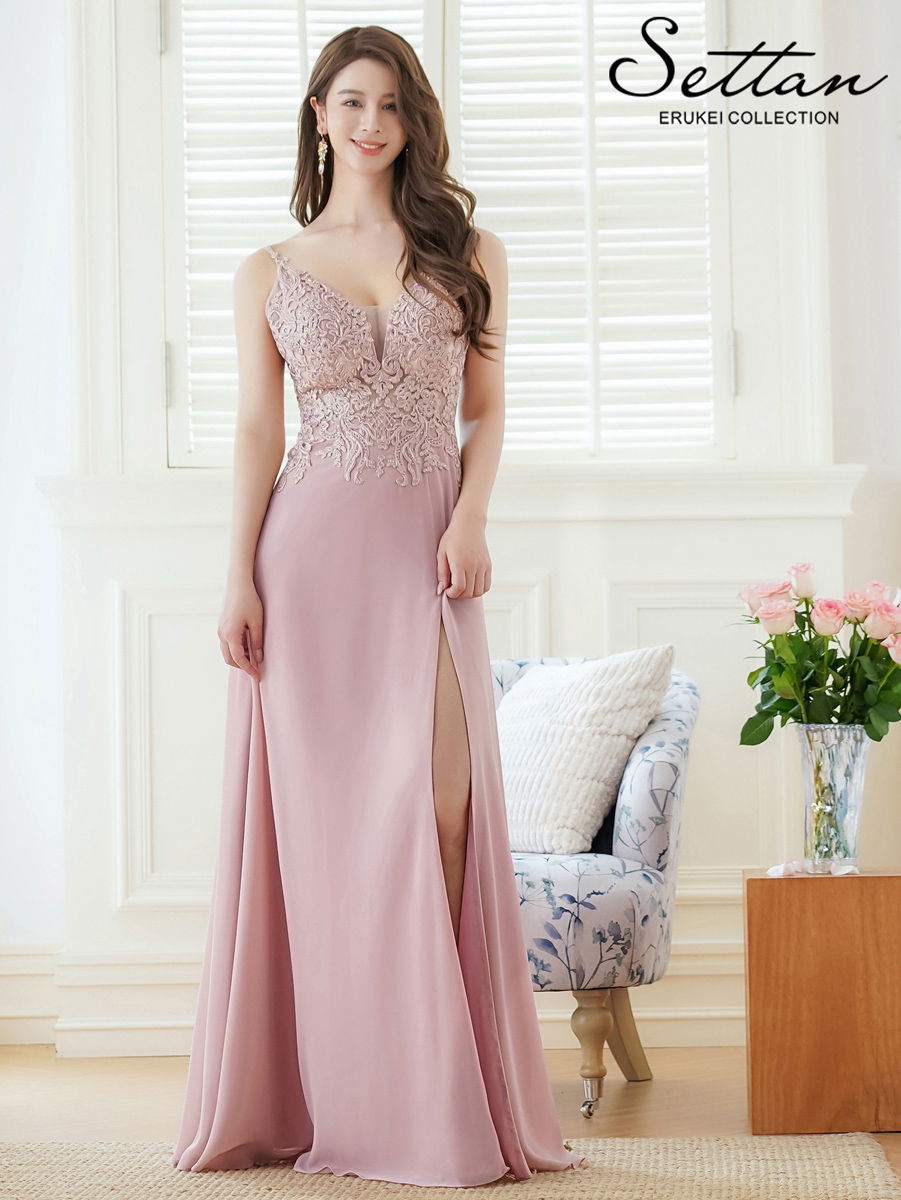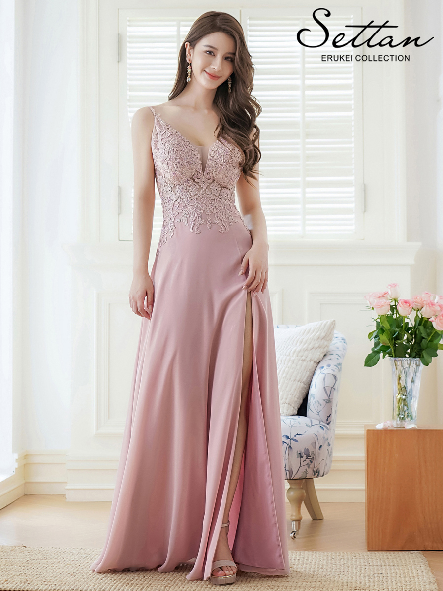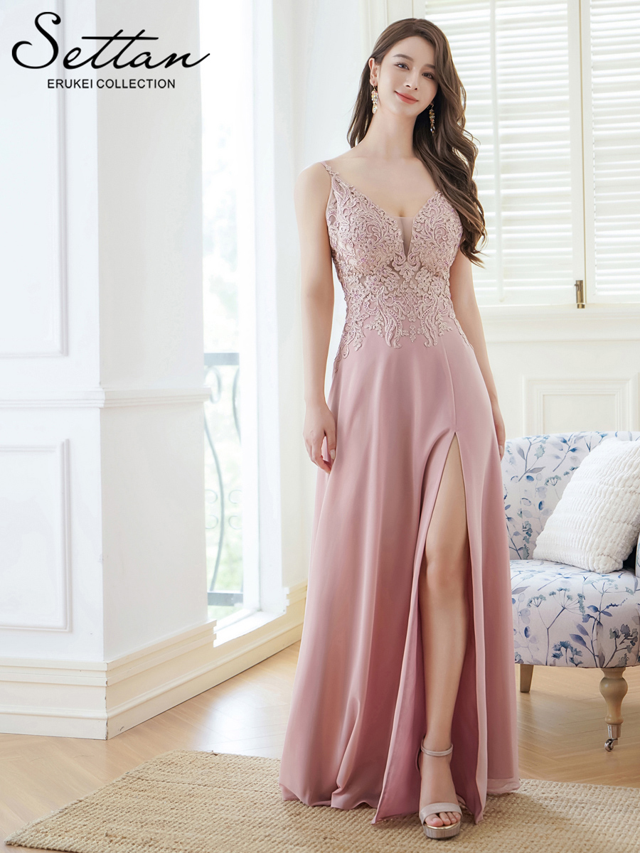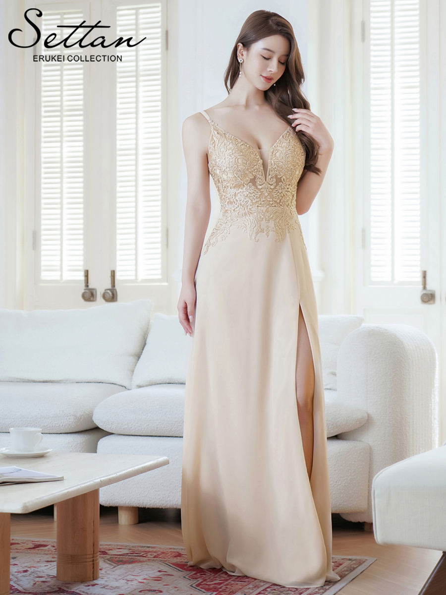 [ERUKEI/SETTAN]ベージュ・ピンク・Vネック・キャミソール・刺繍・セクシー・シアー・シースルー・Aライン・ロングドレス[送料無料]