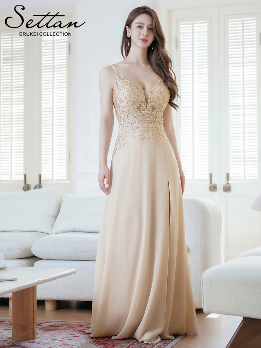 [ERUKEI/SETTAN]ベージュ・ピンク・Vネック・キャミソール・刺繍・セクシー・シアー・シースルー・Aライン・ロングドレス[送料無料] [lk-s36121]