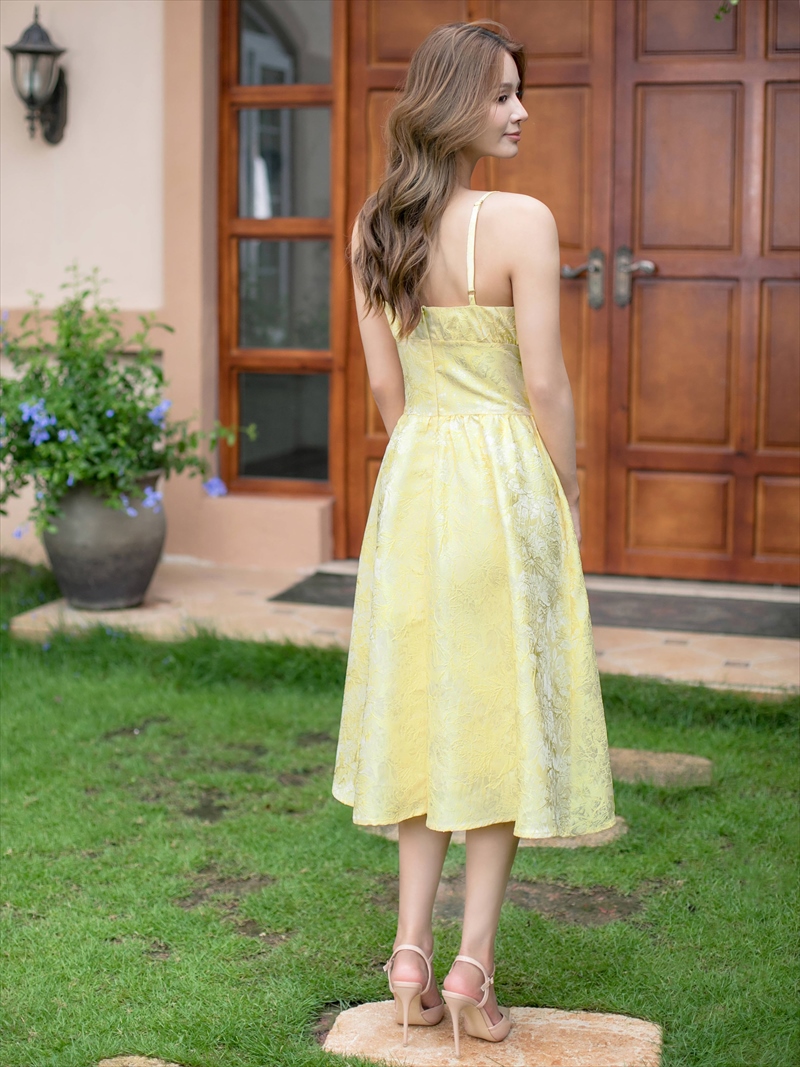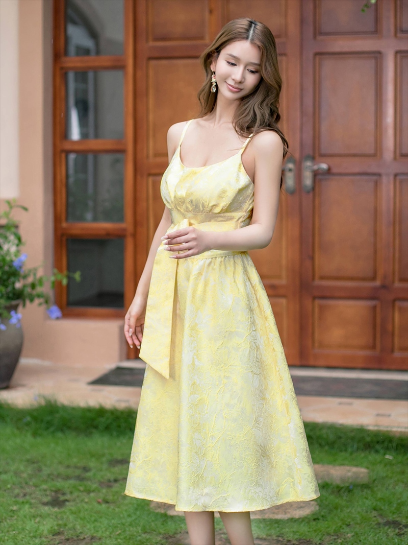 [ XS-Lサイズ / 1カラー ][ERUKEI]イエロー・ジャガード・Aライン・フレア・リボン・キャミソール・ミディアムドレス・ワンピース[送料無料] [lk-e22028]