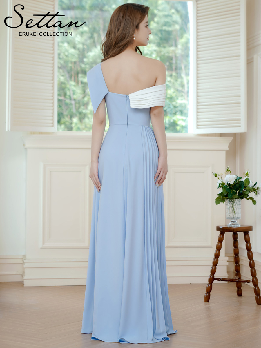 [ XS-Lサイズ / 1カラー ][ERUKEI/SETTAN]ブルー×ホワイト・バイカラー・ワンショルダー・変形襟・アシンメトリー・プリーツ・Aライン・ロングドレス[送料無料] [lk-s37106]