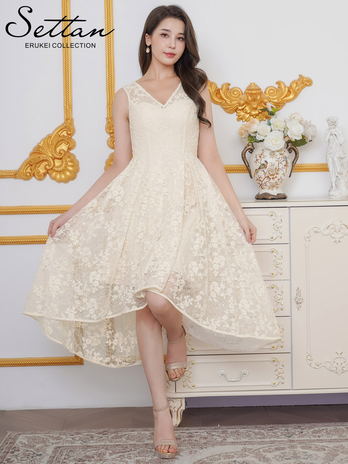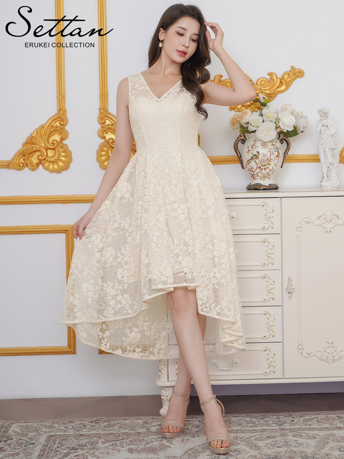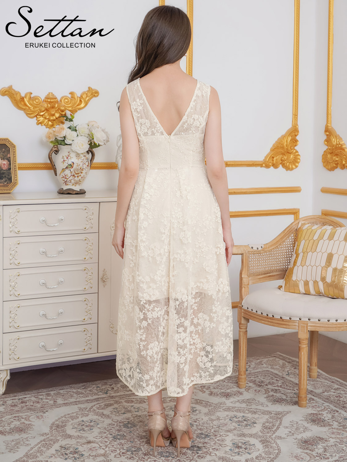 [ XS-Lサイズ / 1カラー ][ERUKEI/SETTAN]総レース・スパンコール・ノースリーブ・Vネック・タック・フィッシュテール・Aライン・ミディアムドレス・ワンピース[送料無料] [lk-s25101]