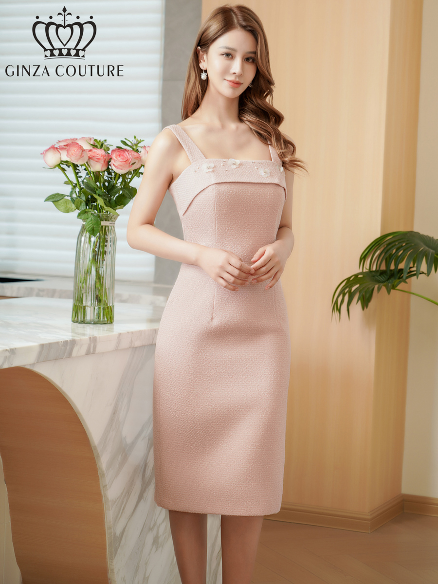 [ XS-Lサイズ / 2カラー ][ERUKEI/GINZA COUTURE]ワンカラー・ツイード・お花・スパンコール・ビーズ・タイト・ミディアムドレス・ワンピース[送料無料]