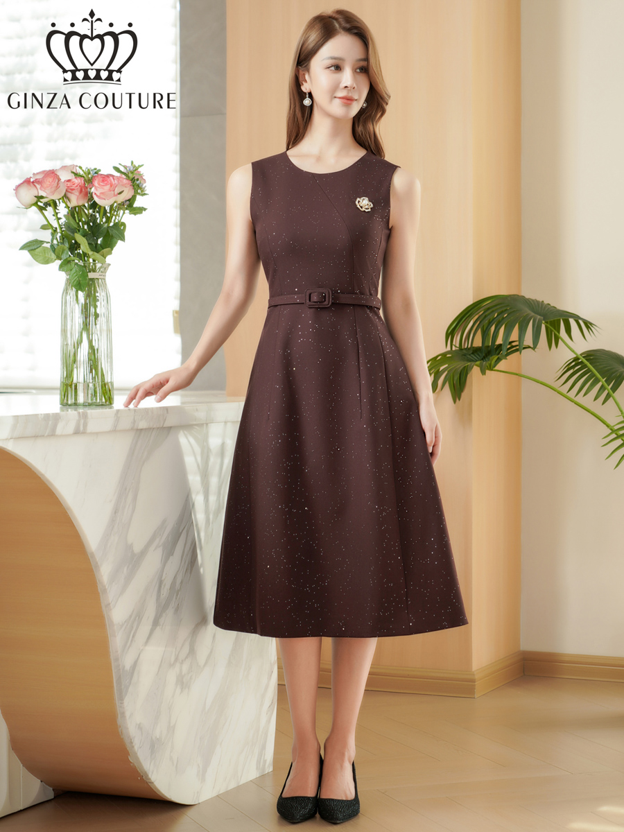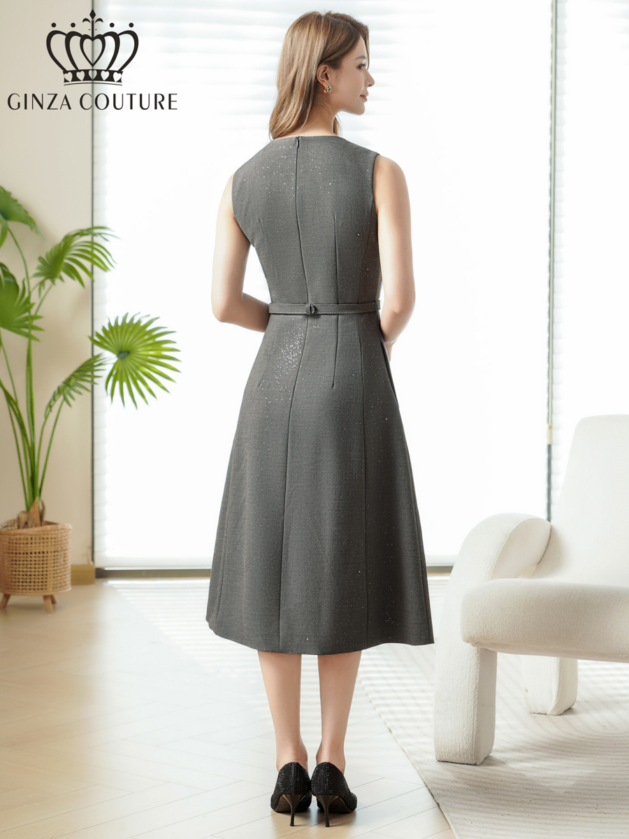 [ XS-Lサイズ / 2カラー][ERUKEI/GINZA COUTURE]グレー・ワインレッド・ラメ・シンプル・ブローチ・ベルト・ノースリーブ・Aライン・ミディアムドレス・ワンピース[送料無料]