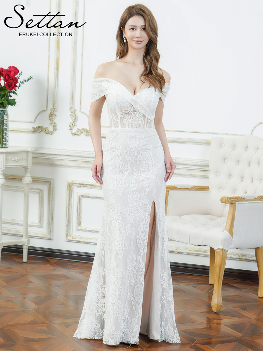 [ XS-Lサイズ / 2カラー][ERUKEI/SETTAN]ホワイト・レッド・総レース・シアー・オフショルダー・コルセット風・スリット・マーメイド・ロングドレス[送料無料]