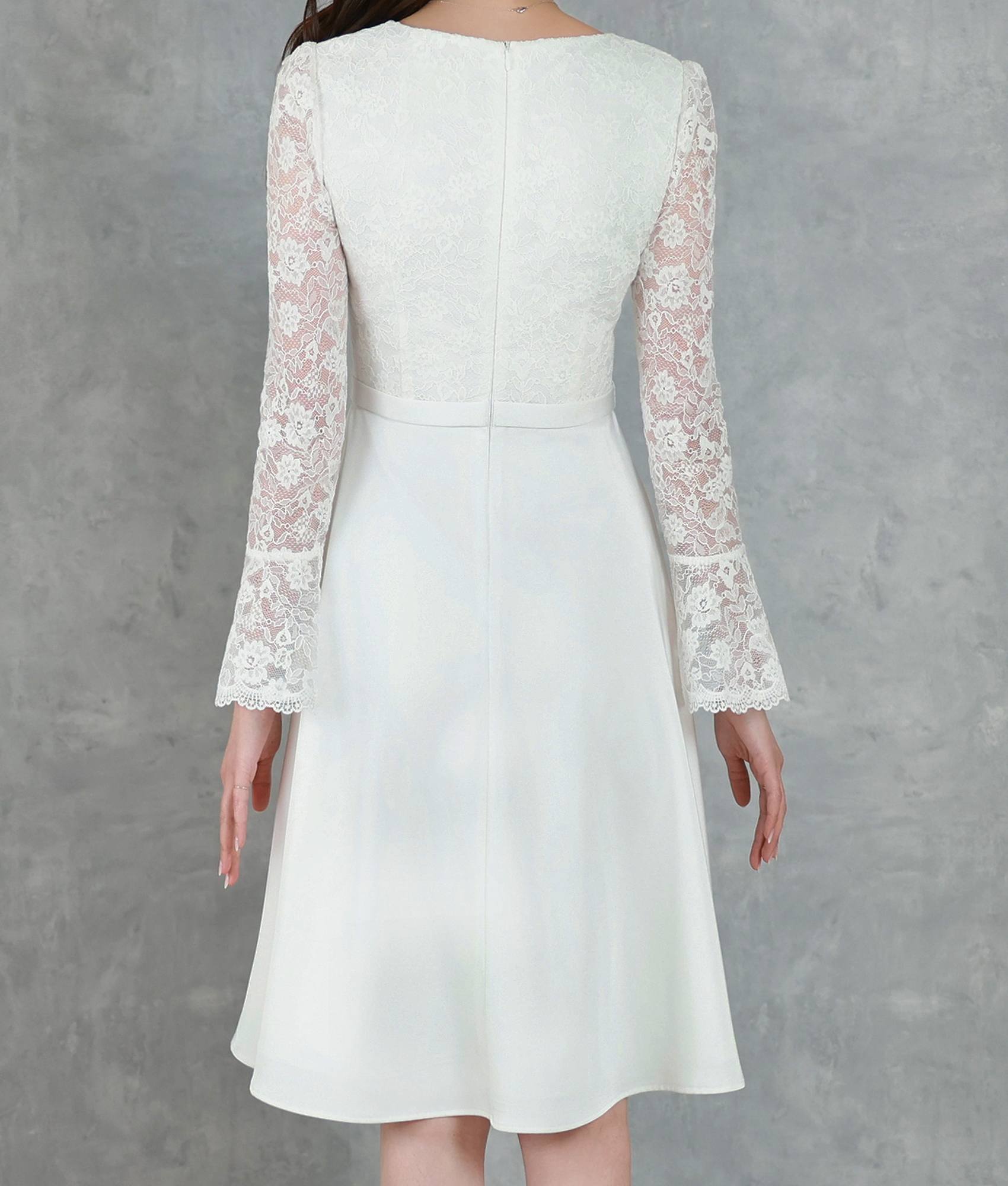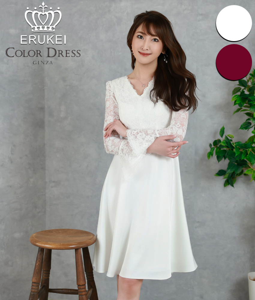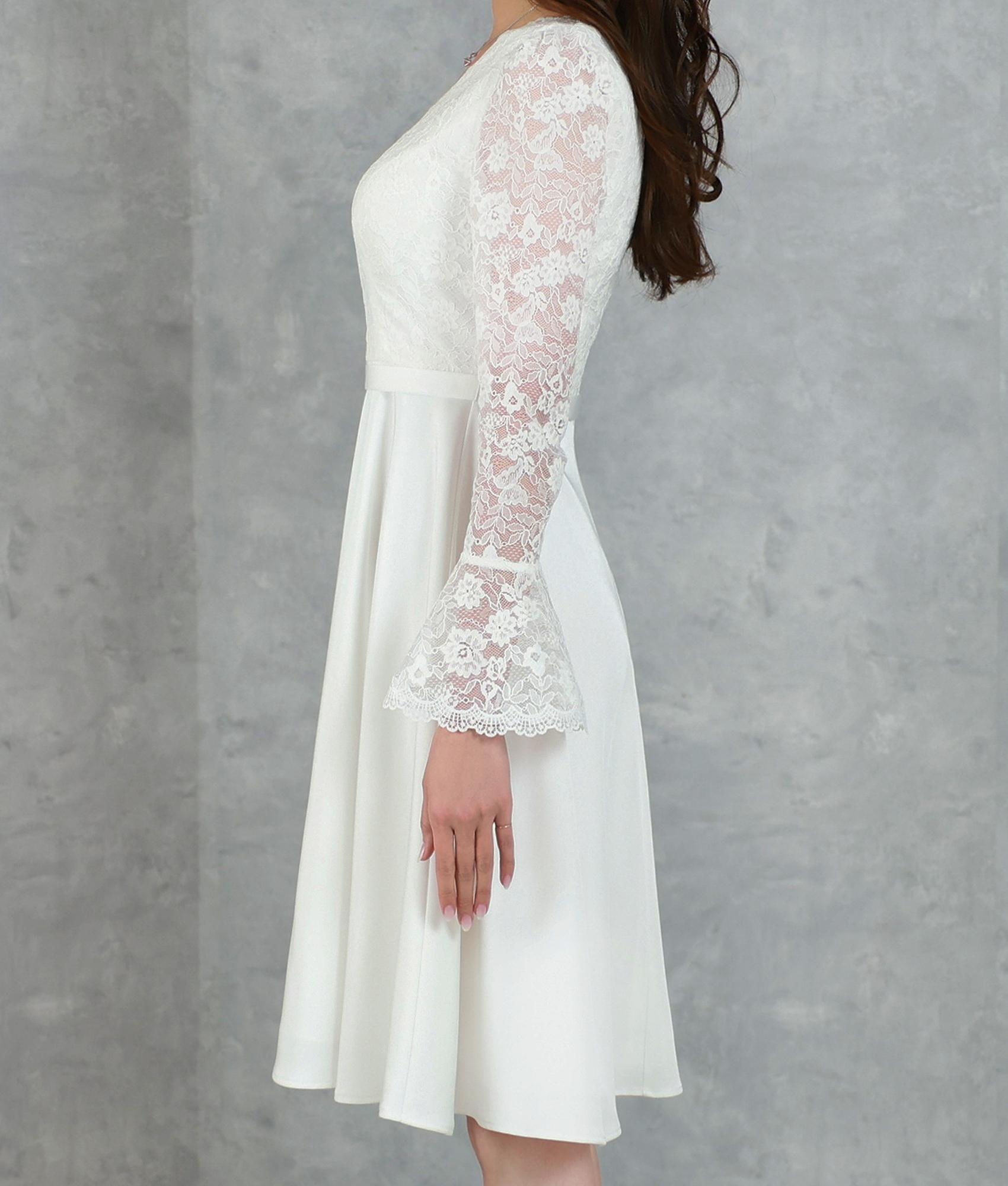 [ XS-Lサイズ / 2カラー][ERUKEI]ワンカラー・レース・サテン・Vネック・長袖・ベルスリーブ・ミディアムドレス・ワンピース[薗田杏奈着用][送料無料]