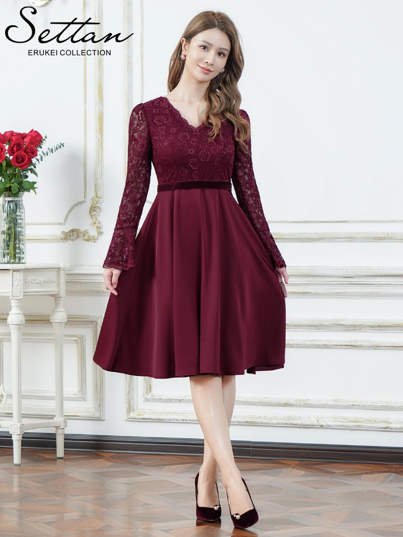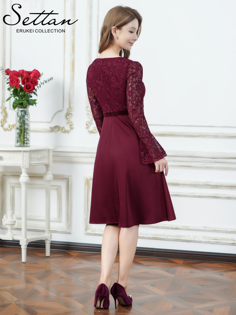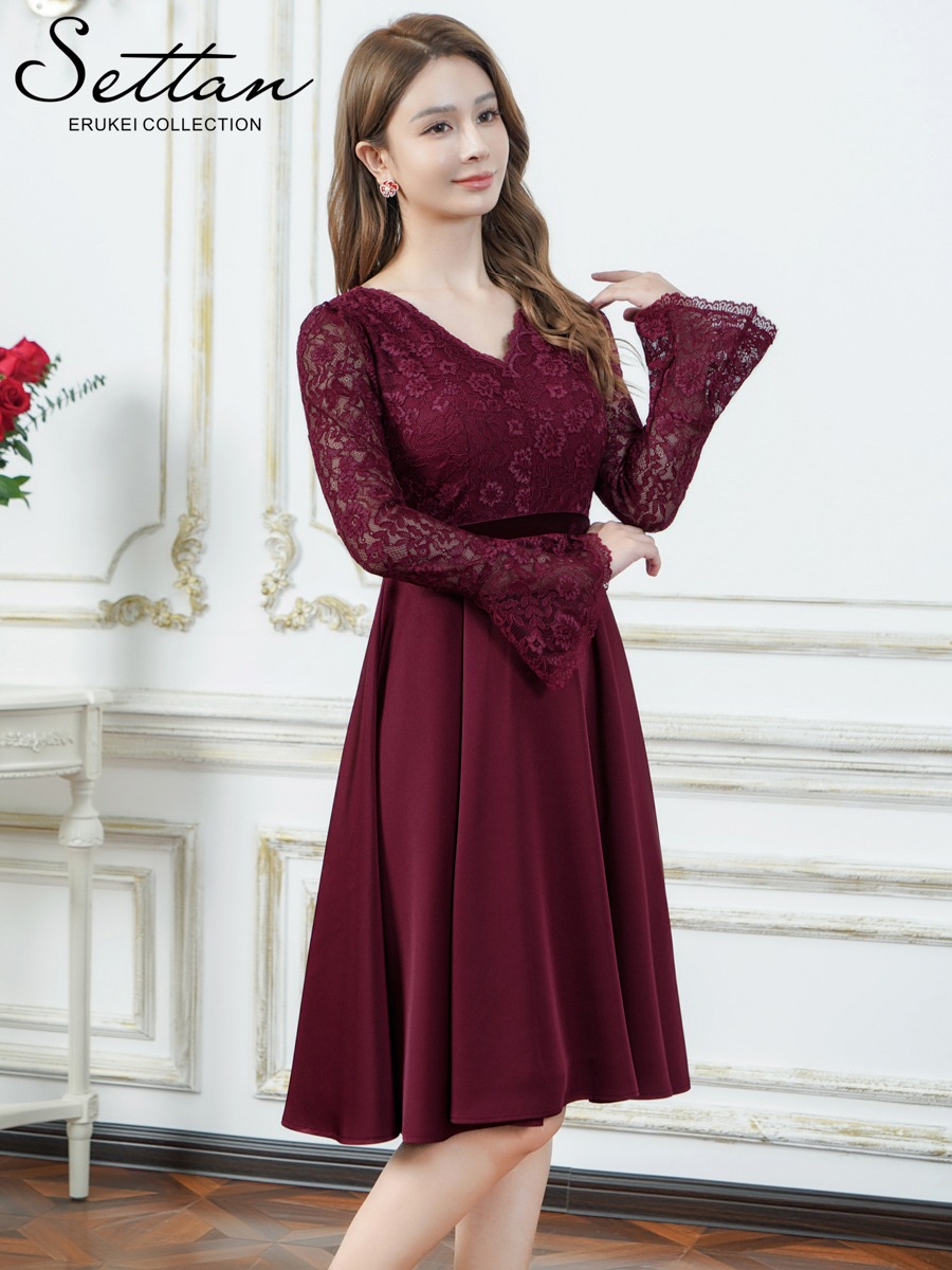 [ XS-Lサイズ / 2カラー][ERUKEI]ワンカラー・レース・サテン・Vネック・長袖・ベルスリーブ・ミディアムドレス・ワンピース[薗田杏奈着用][送料無料] [lk-s25318]