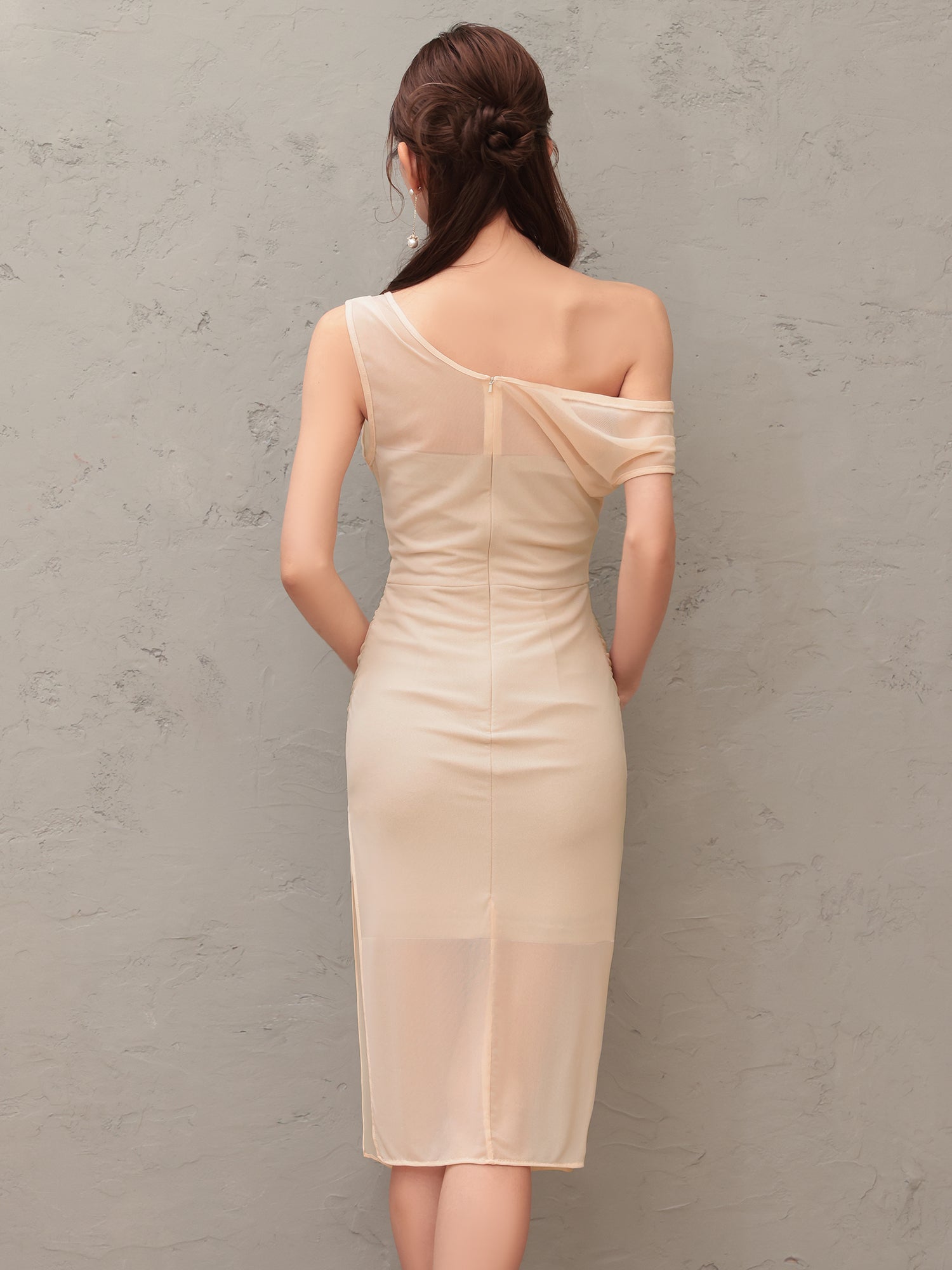 [ XS-Mサイズ / 4カラー ][Veautt]ワンショルダー・シアー・メッシュ・スリット・タイト・ミディアムドレス《送料&代引き手数料無料》