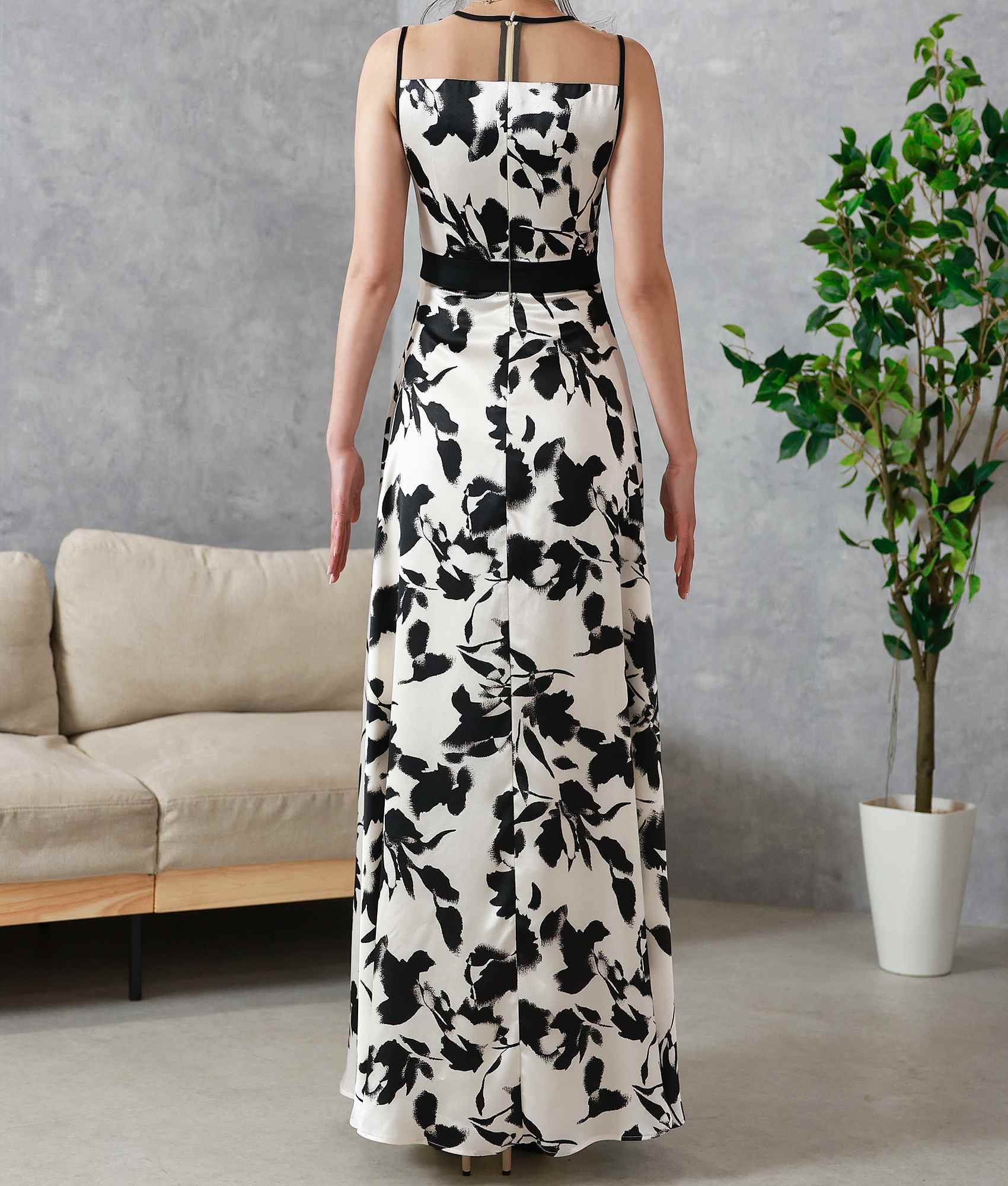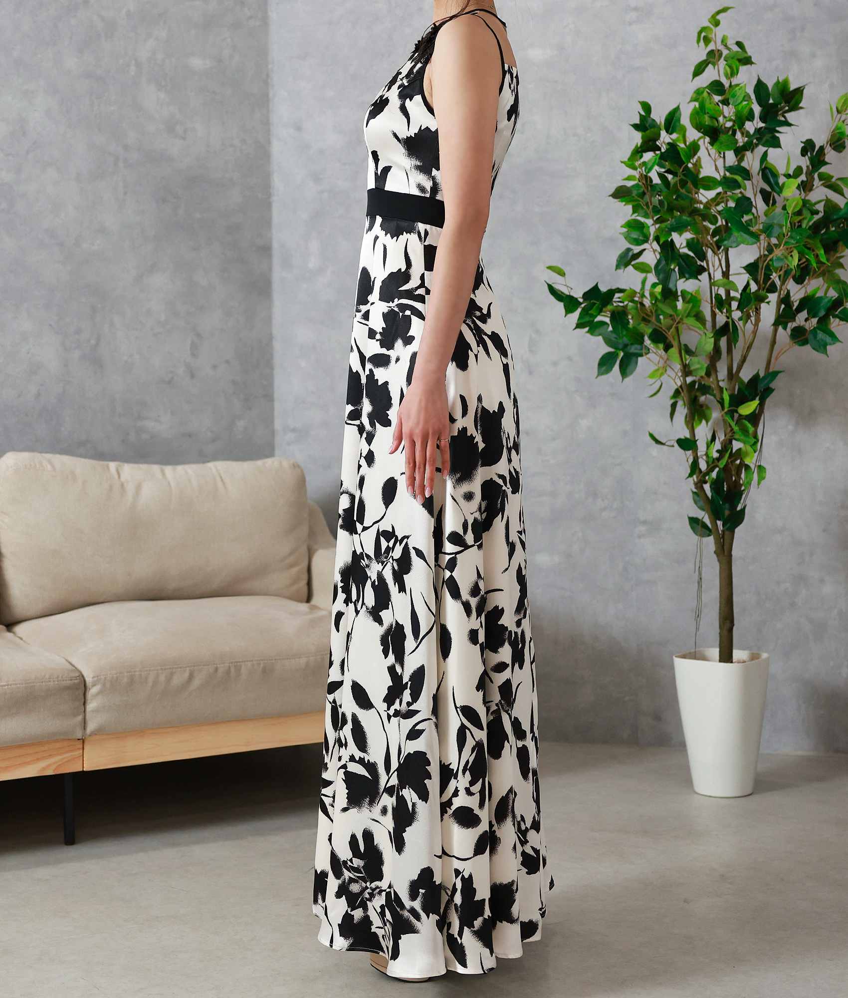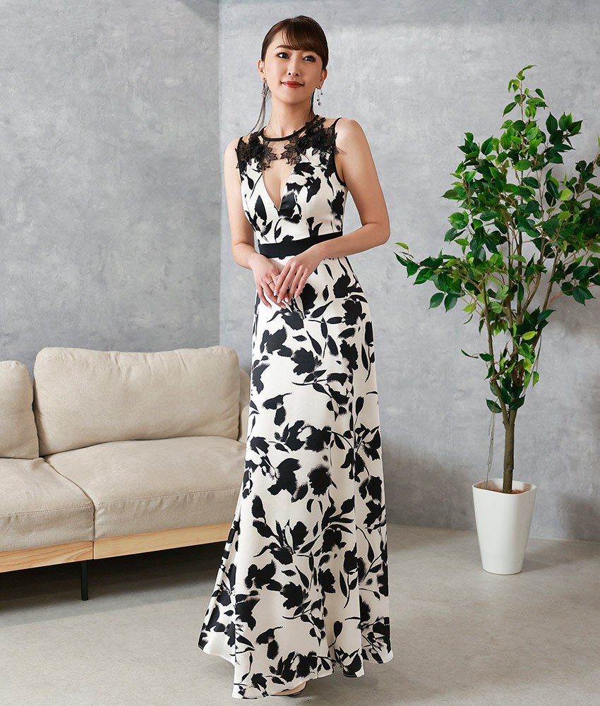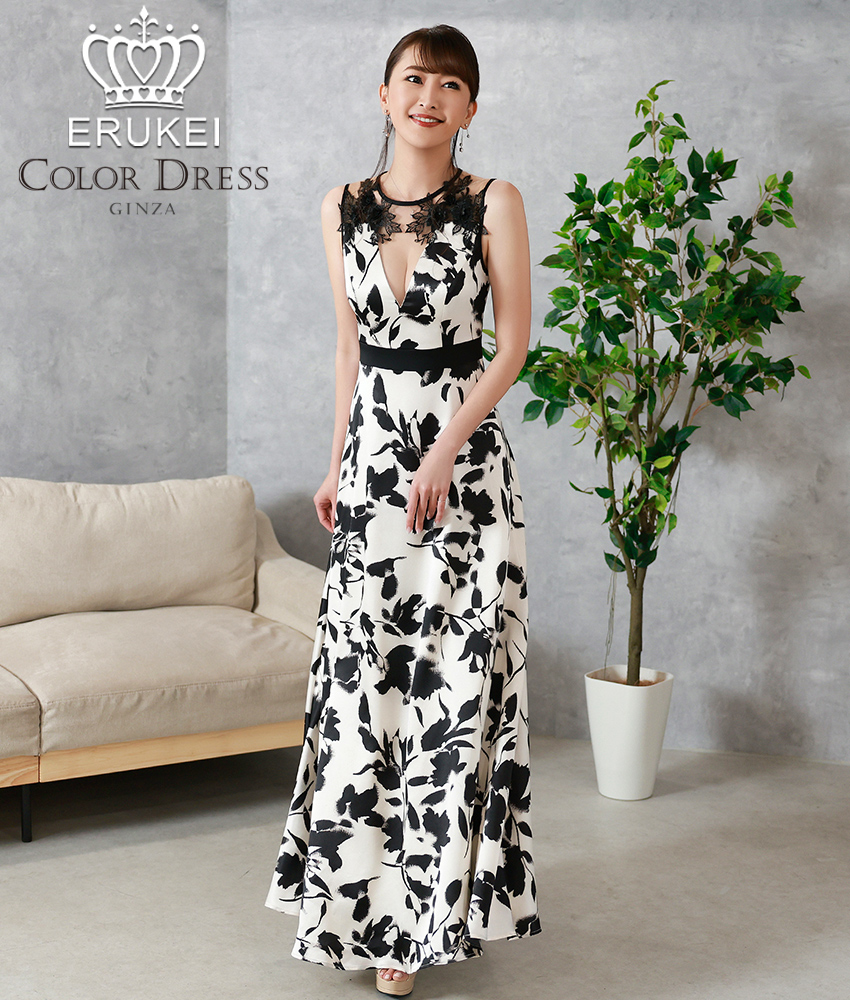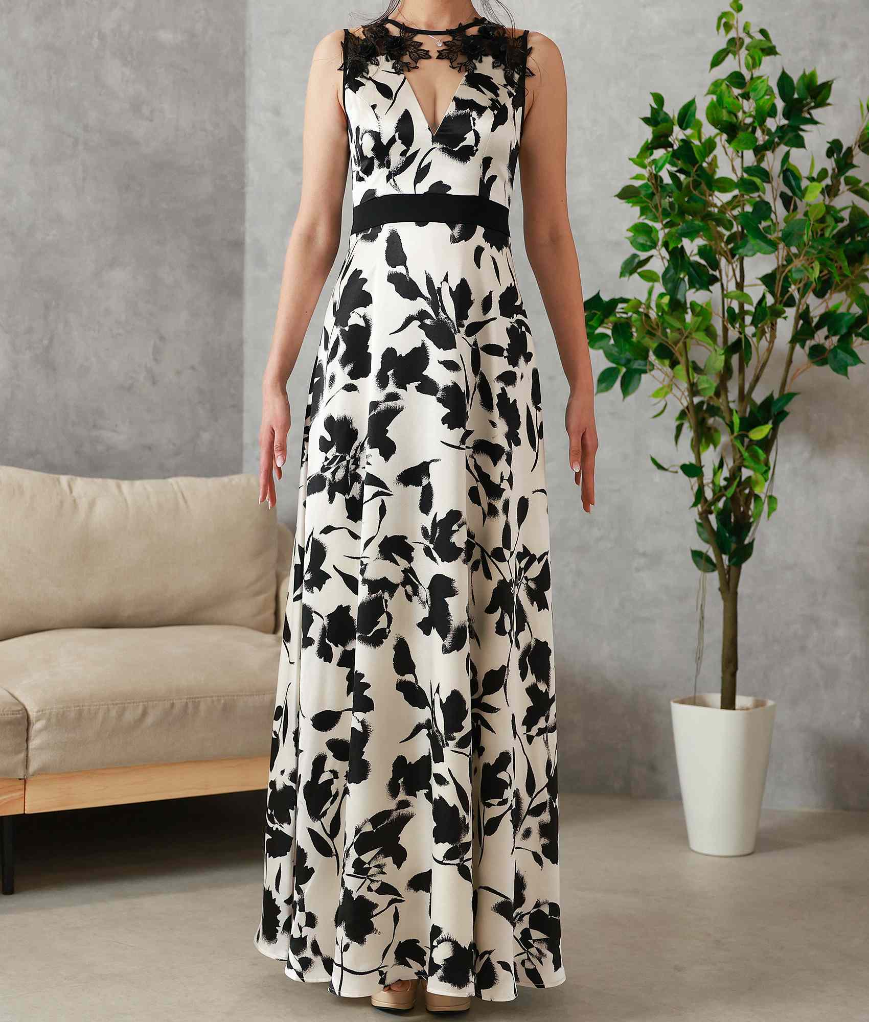[ XS-Lサイズ / 1カラー][ERUKEI]モノトーン・リーフ柄・花柄・レースネック・Aライン・ノースリーブ・ロングドレス・ワンピース[薗田杏奈着用][送料無料]