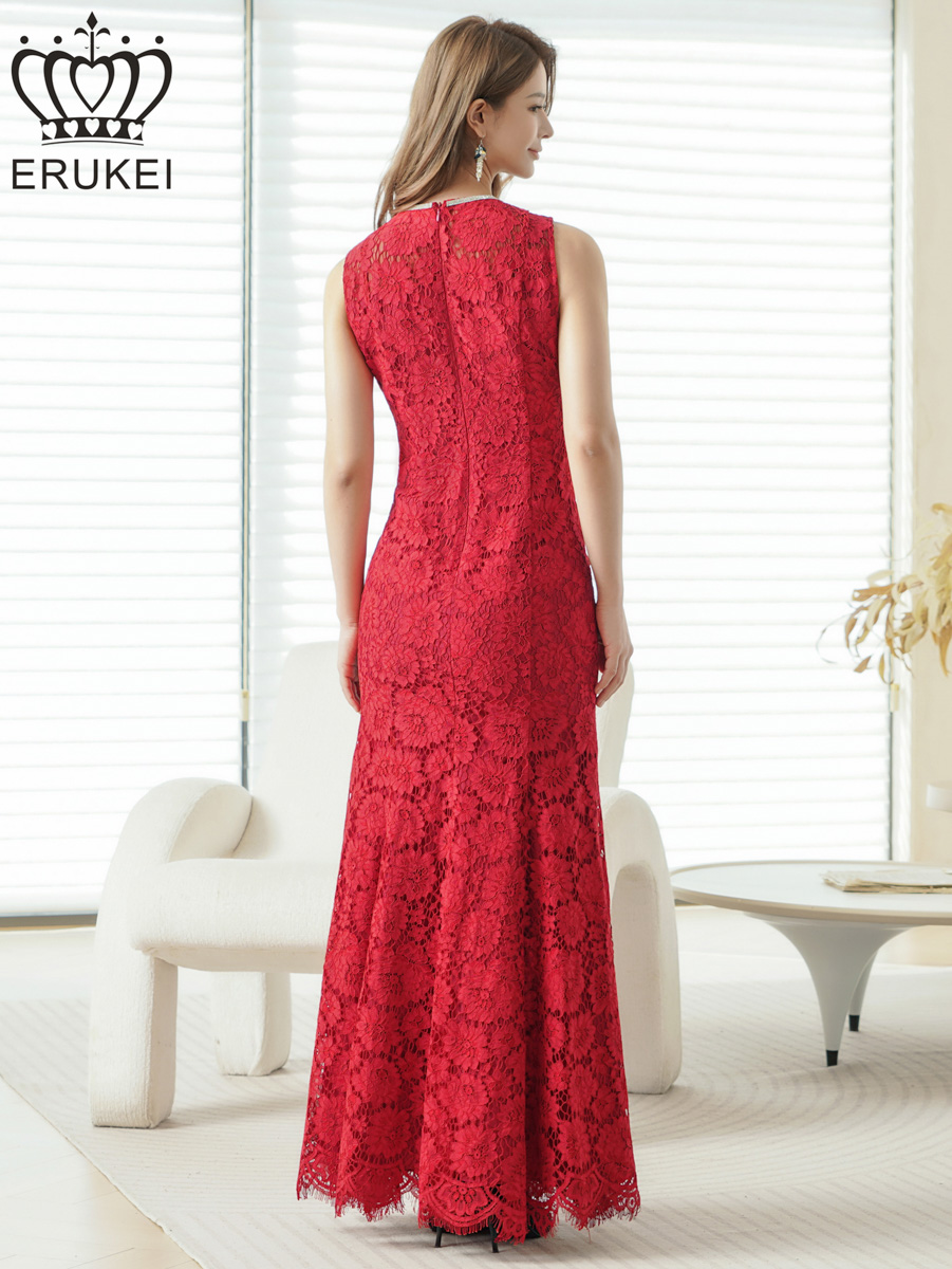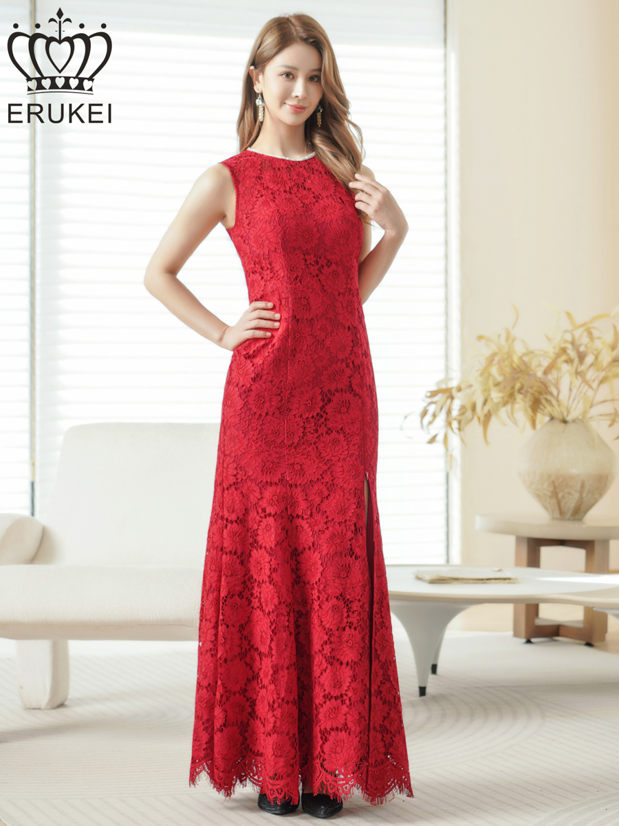 [ XS-Lサイズ / 2カラー][ERUKEI]総レース・ネックビジュー・ラインストーン・ノースリーブ・スリット・マーメイド・ロングドレス[送料無料] [lk-e25194]