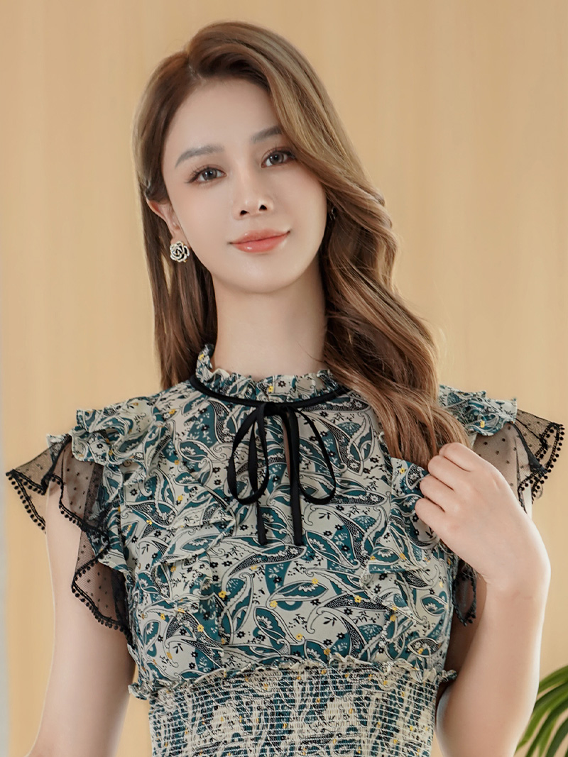 [ XS-XLサイズ / 1カラー][ERUKEI/SETTAN]グリーン・ペイズリー柄・シフォン・フリルスリーブ・プチハイネック・ティアード・Aライン・ミディアムドレス・ワンピース[送料無料] [lk-s111208]