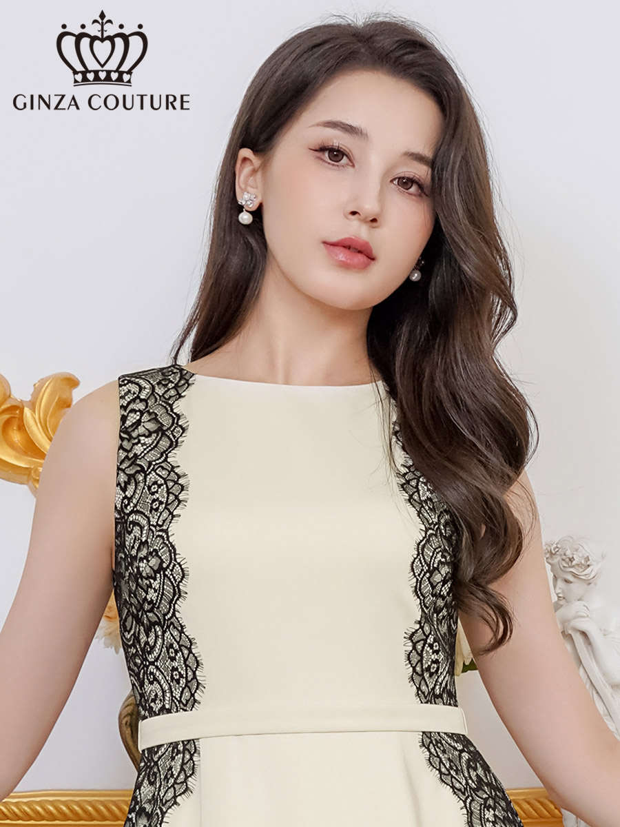 [ XS-Lサイズ / 1カラー][ERUKEI/GINZA COUTURE]アイボリー×ブラック・ノースリーブ・サイドレース・Aライン・フレア・ミニドレス・ワンピース[送料無料] [lk-c25164]
