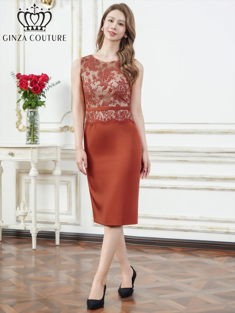 [ XS-Lサイズ / 1カラー][ERUKEI/GINZA COUTURE]レース・サテン・切替・ウエストマーク・上品・タイト・ミディアムドレス・ワンピース[送料無料] [lk-c25319]