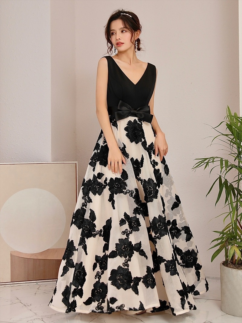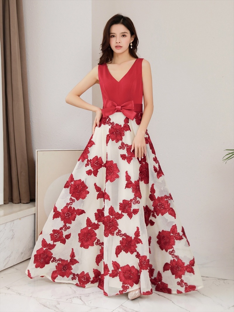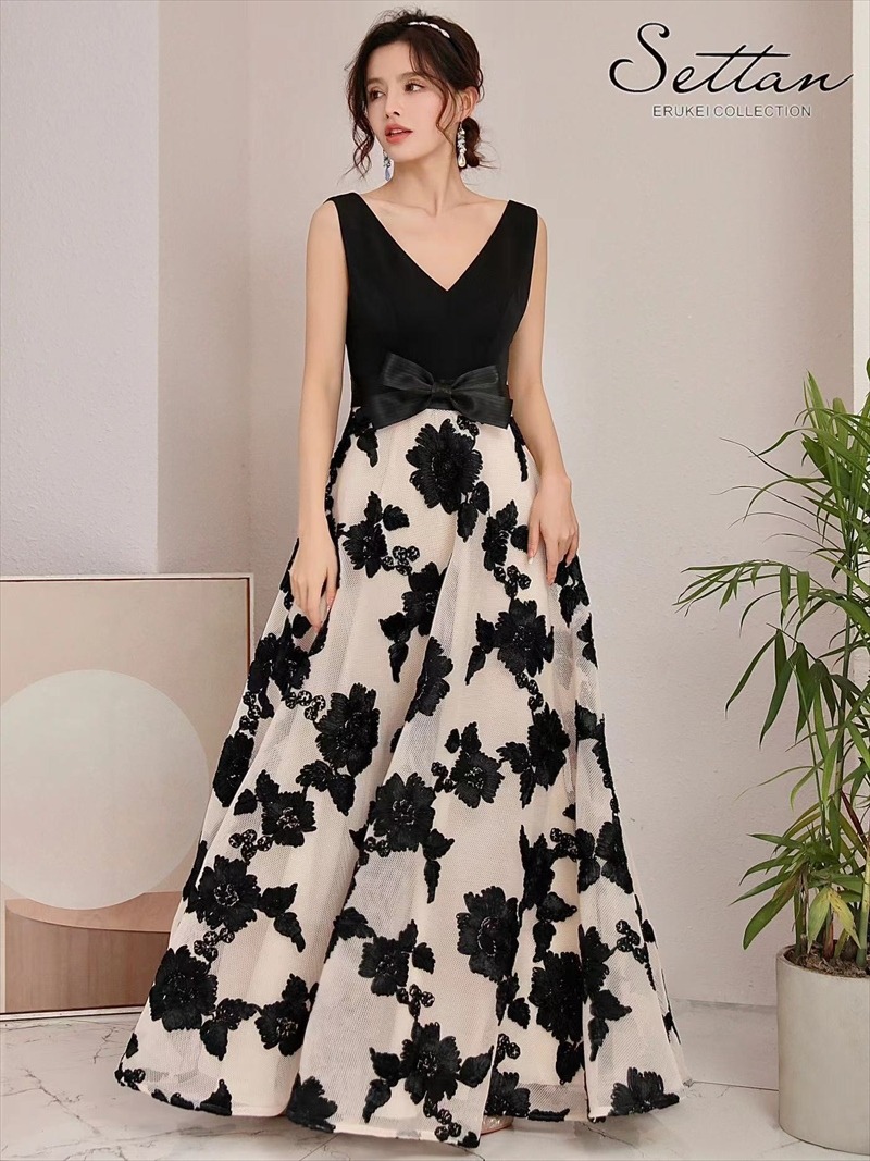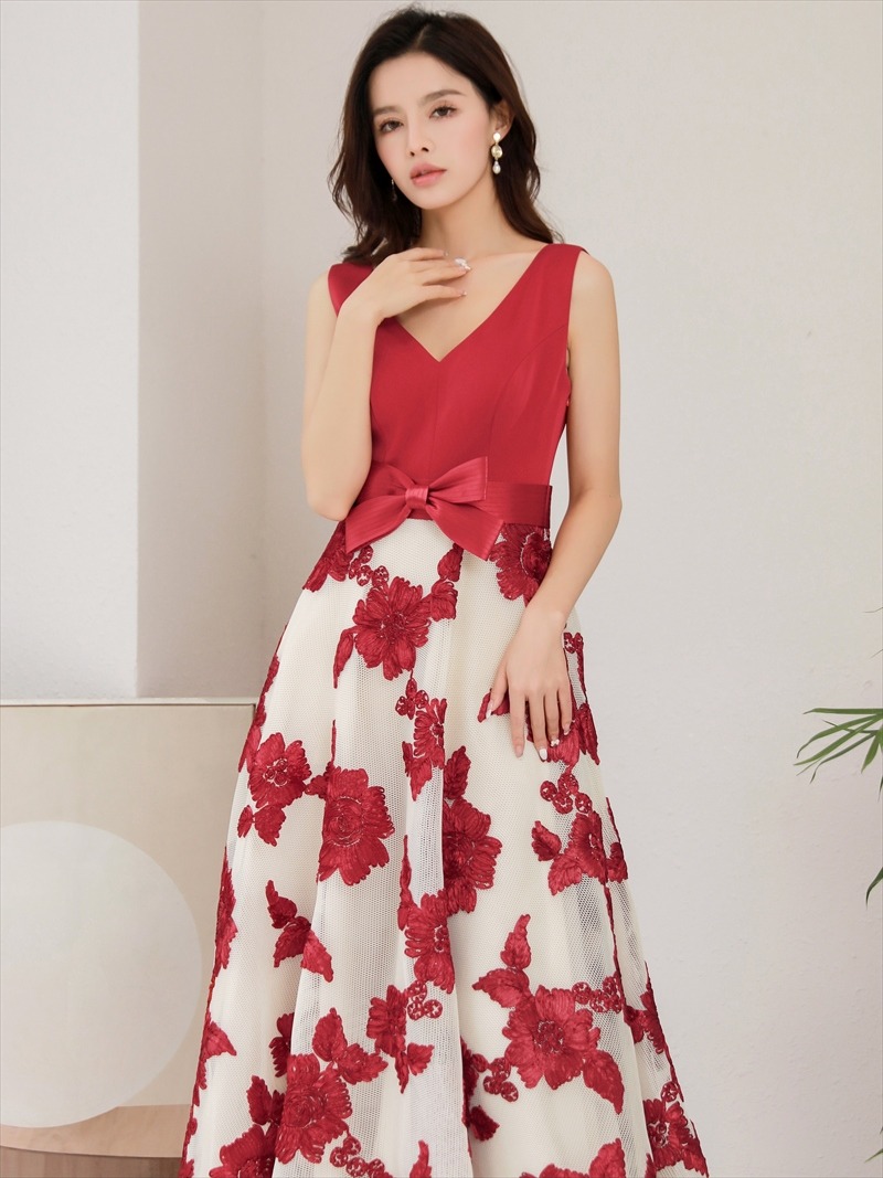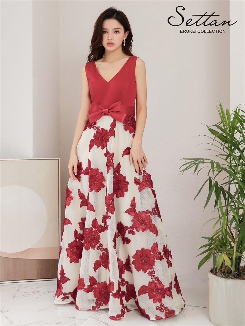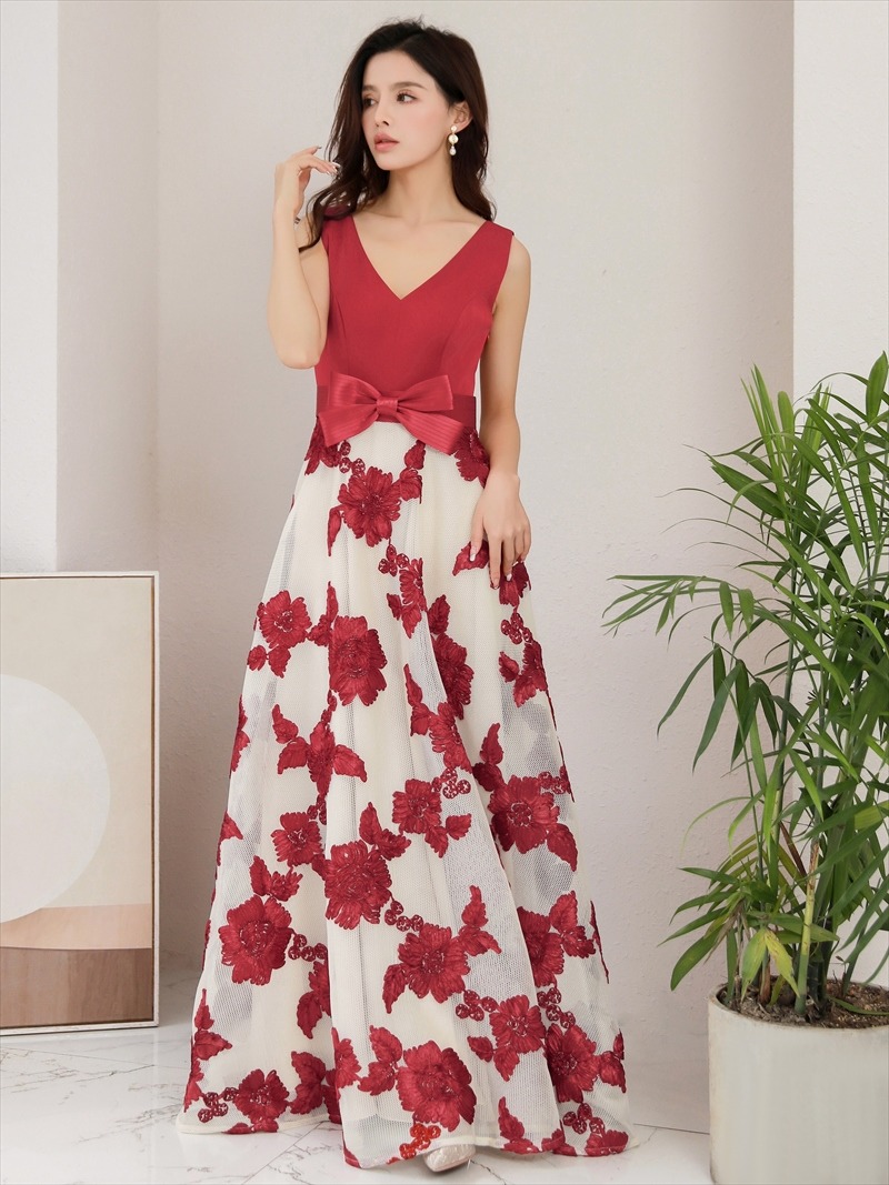 [ XS-Lサイズ / 2カラー ][ERUKEI/SETTAN]ブラック・レッド・立体刺繍・ウエストリボン・Aライン・Vネック・ロングドレス[送料無料] [lk-s31176]