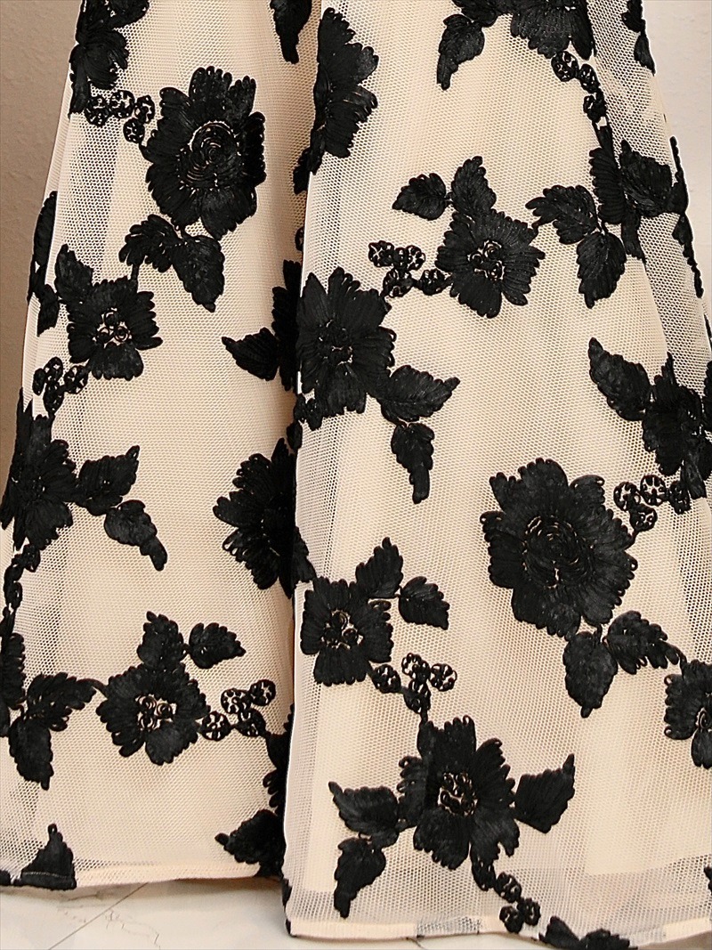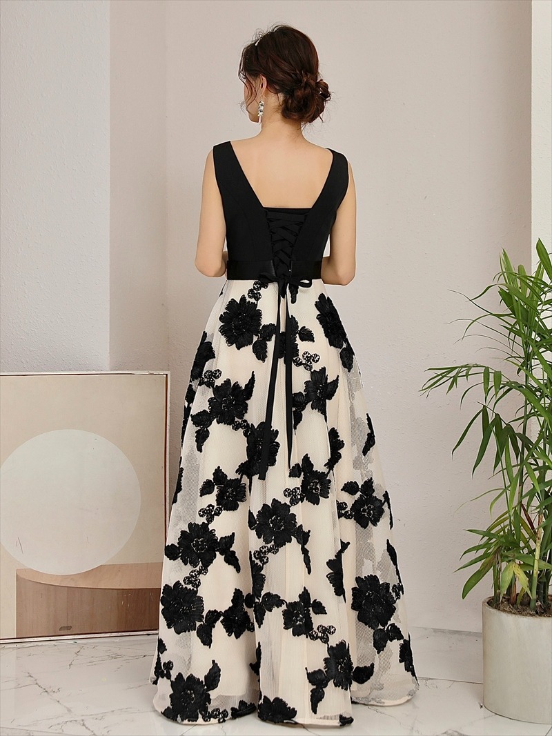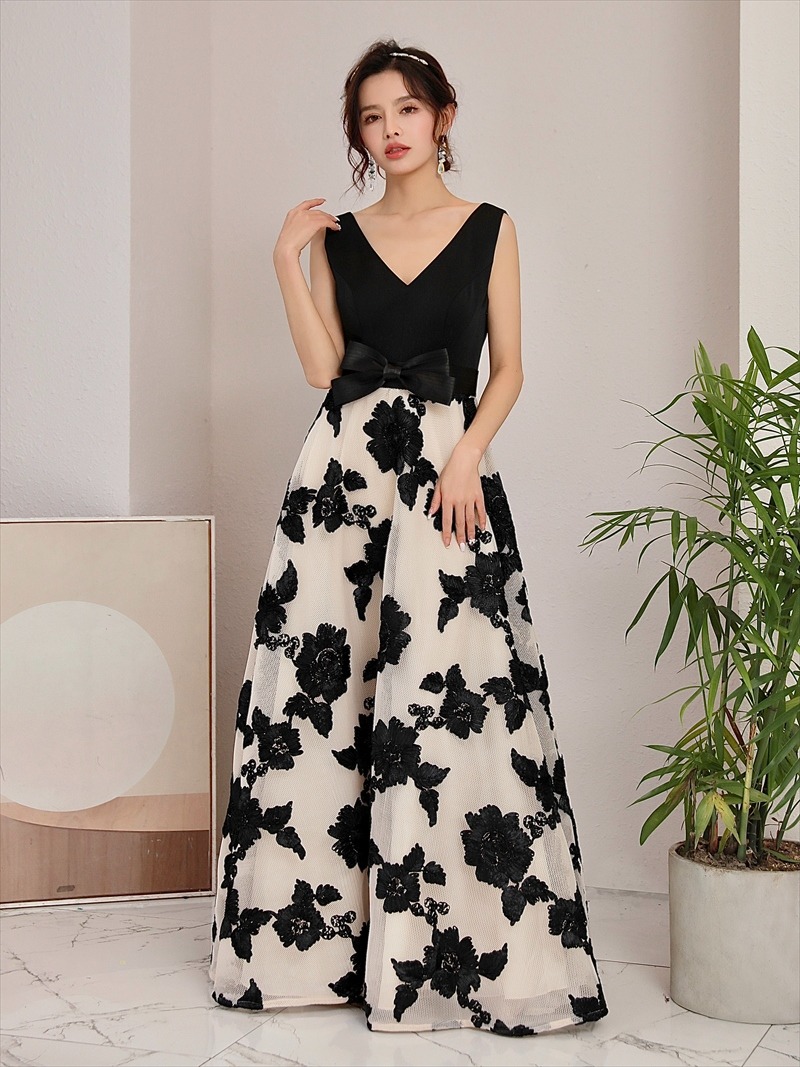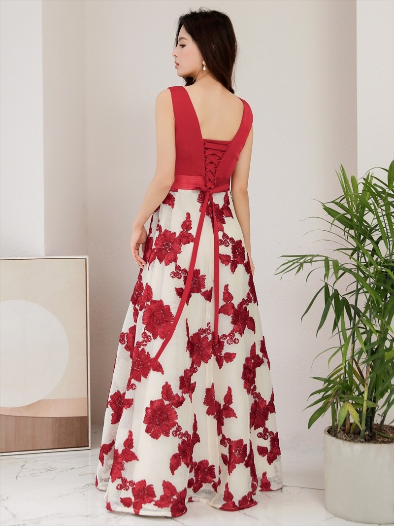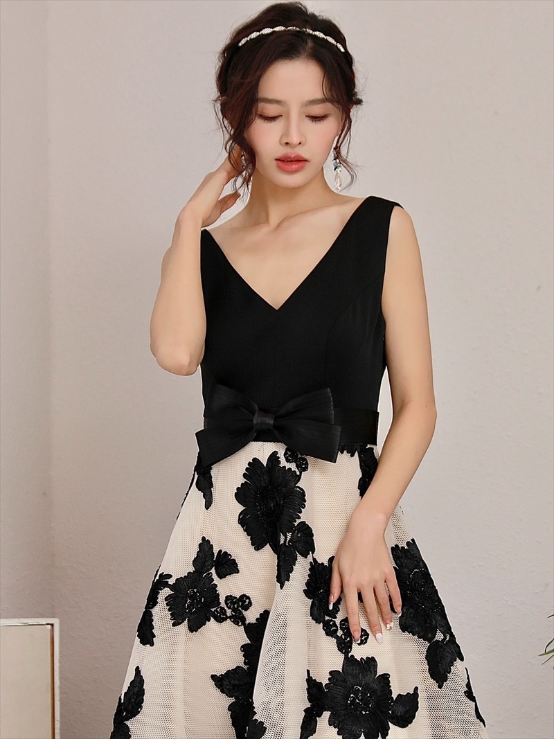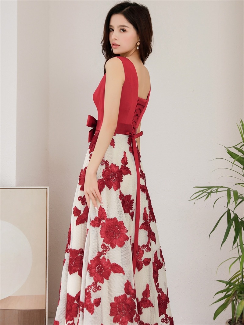 [ XS-Lサイズ / 2カラー ][ERUKEI/SETTAN]ブラック・レッド・立体刺繍・ウエストリボン・Aライン・Vネック・ロングドレス[送料無料]