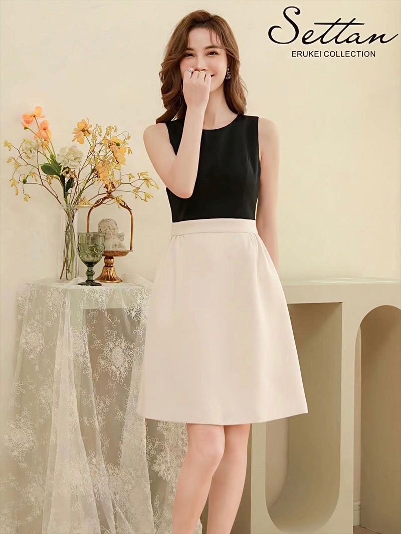 [ XS-Lサイズ / 1カラー][ERUKEI/SETTAN]ブラック×ホワイト・バックリボン・リボン・バイカラー・ノースリーブ・ミニドレス・ワンピース[送料無料]