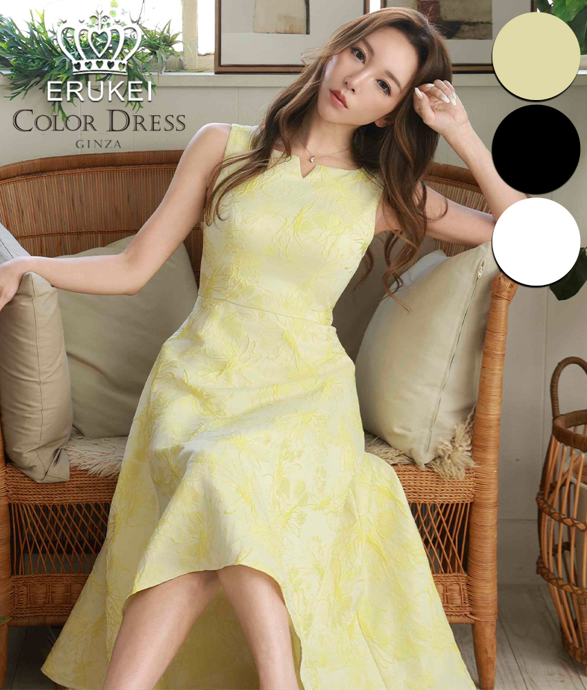 [ XS-Lサイズ / 3カラー][ERUKEI]ジャガード・花柄・スリットネック・フィッシュテール・Aライン・ミディアムドレス・ワンピース[山崎みどり着用][送料無料]myyl [lk-c25075]