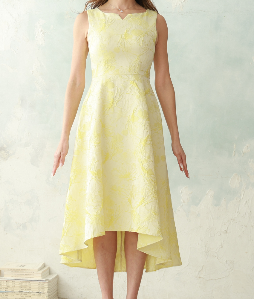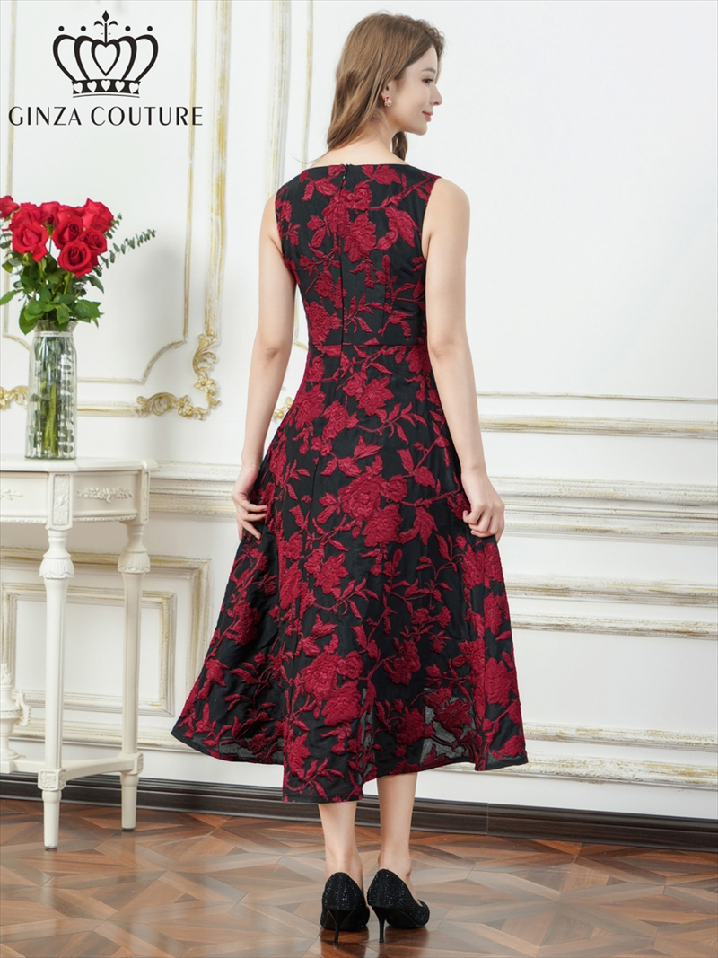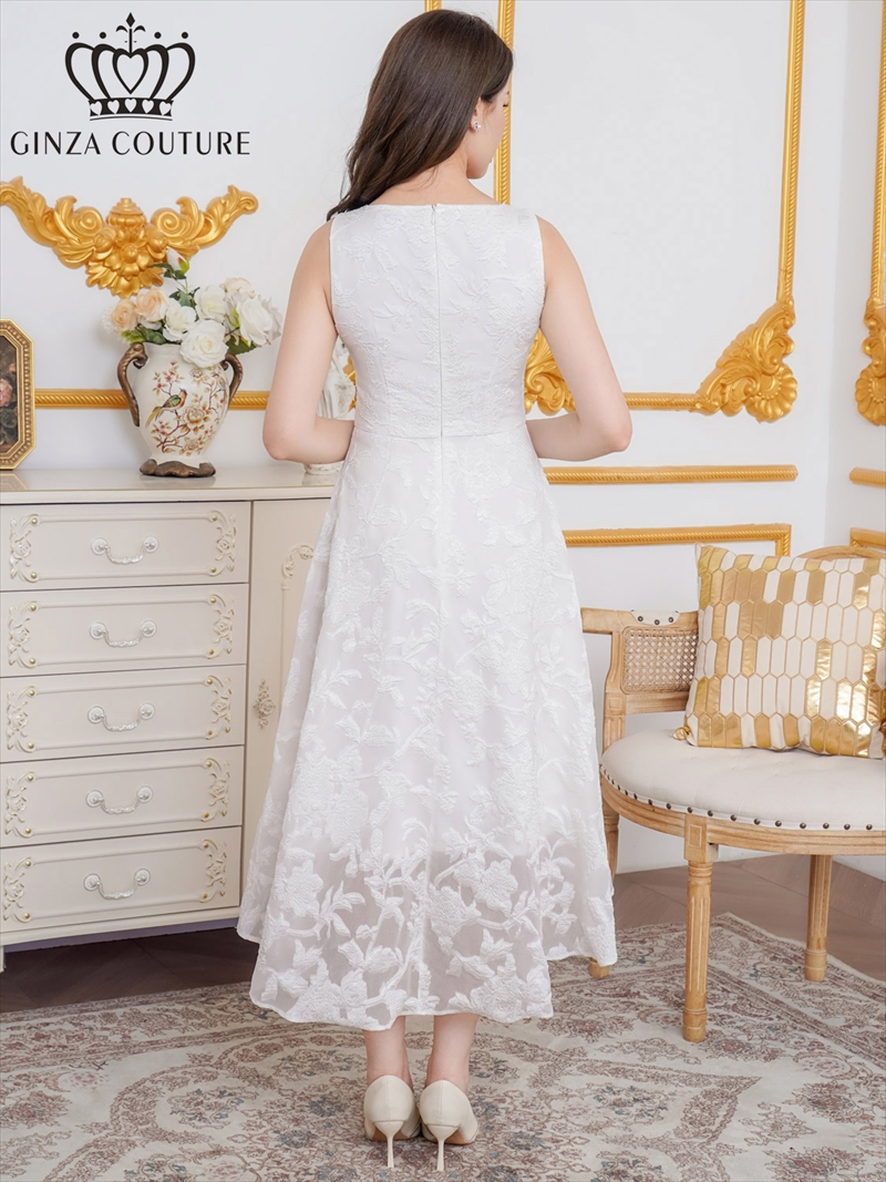 [ XS-Lサイズ / 2カラー][ERUKEI/GINZA COUTURE]オーガンジー・ジャガード・花柄・金糸・ノースリーブ・Vネック・Aライン・フレア・ミディアムドレス・ワンピース[送料無料] [lk-c25166]