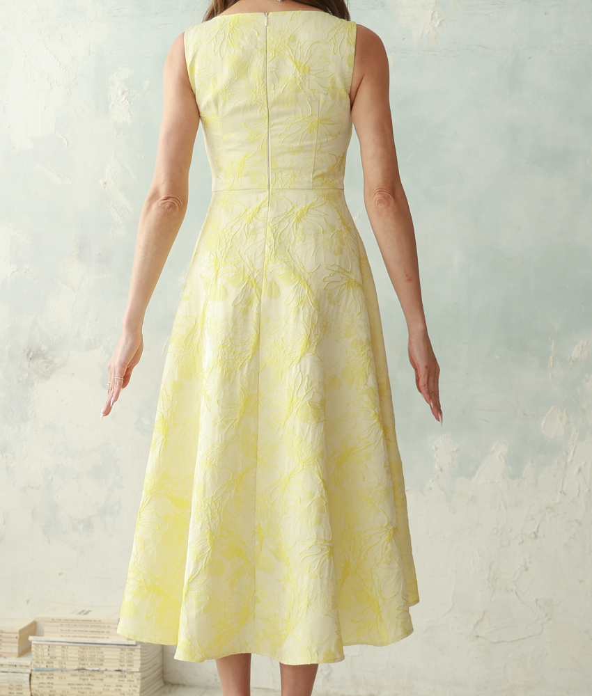 [ XS-Lサイズ / 1カラー ][ERUKEI]イエロー・ジャガード・Aライン・フレア・リボン・キャミソール・ミディアムドレス・ワンピース[送料無料] [lk-e22028]