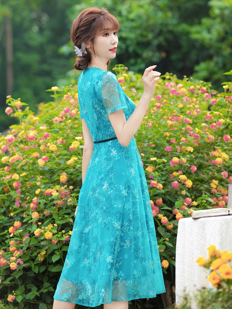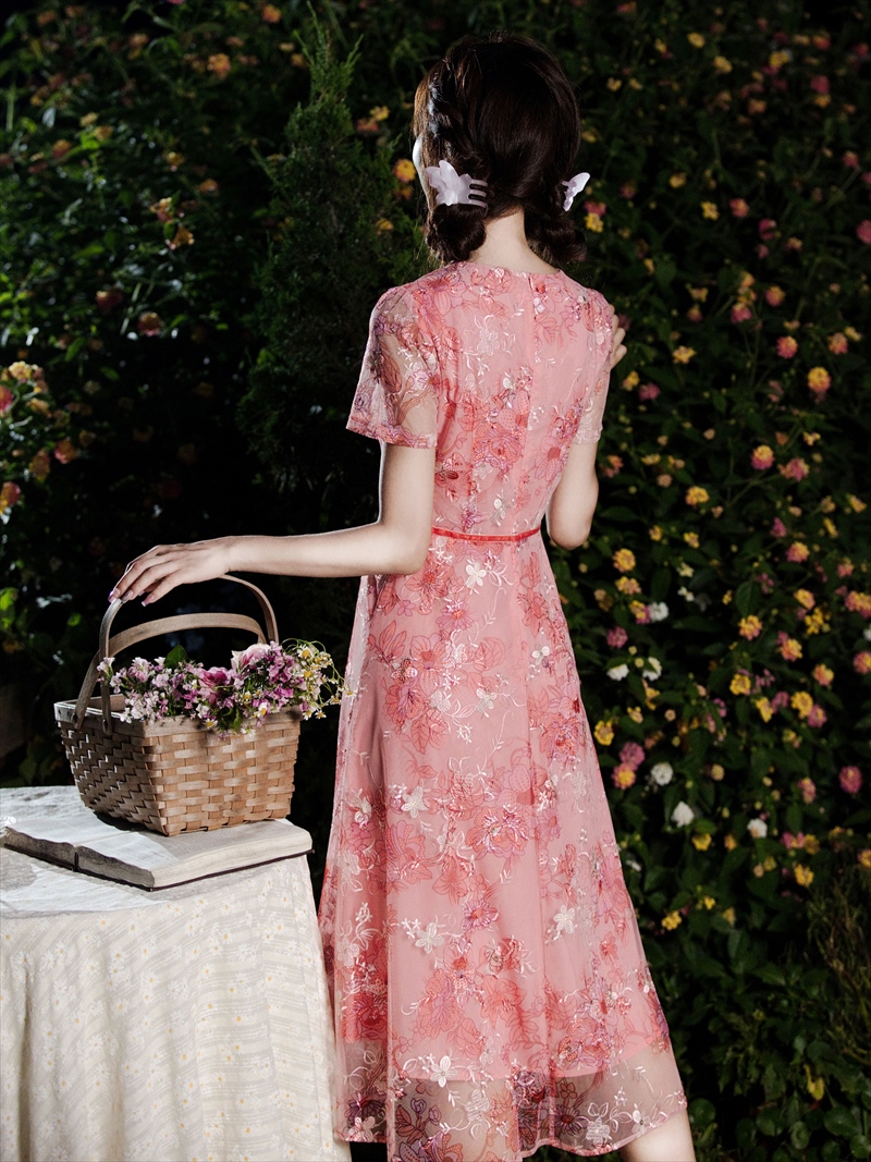 [ XS-Lサイズ / 2カラー][ERUKEI/GINZA COUTURE]ピンク・グリーン・総レース・半袖・Aライン・ミディアムドレス・ワンピース[送料無料] [lk-c2653]