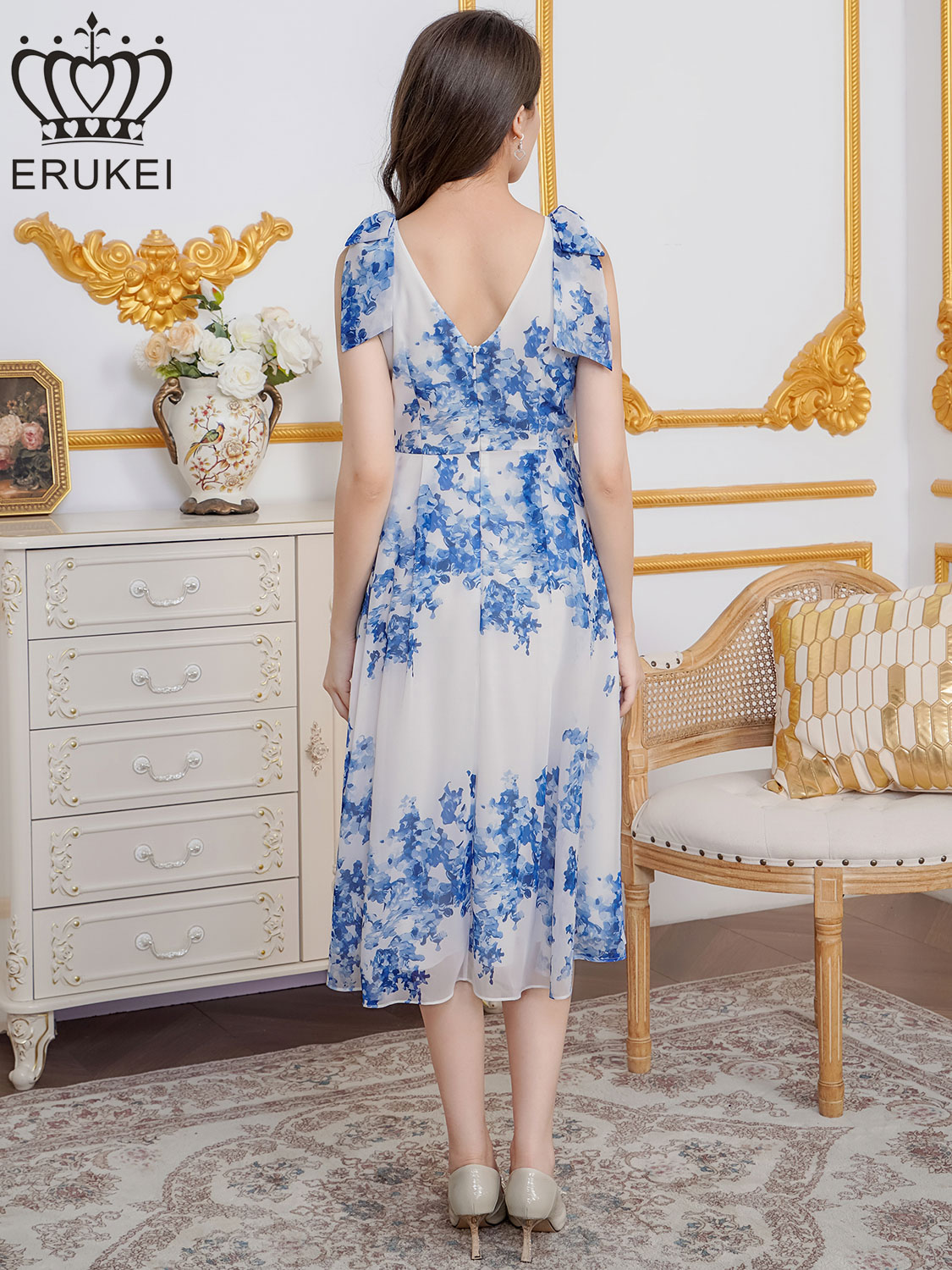 [ XS-Lサイズ / 1カラー][ERUKEI]花柄・プリント・シフォン・Vネック・ノースリーブ・肩リボン・タック・フレア・Aライン・ミディアムドレス・ワンピース[送料無料] [lk-e25190]