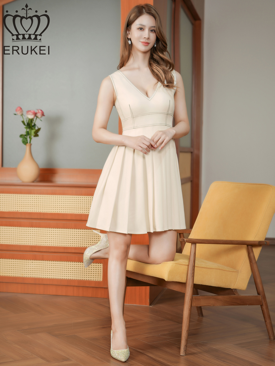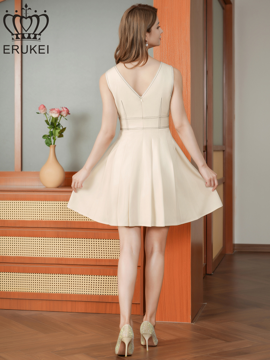 [ XS-Lサイズ / 1カラー][ERUKEI]ステッチ・Vネック・ノースリーブ・プリーツ・Aライン・ミニドレス・ワンピース[送料無料] [lk-e25116]