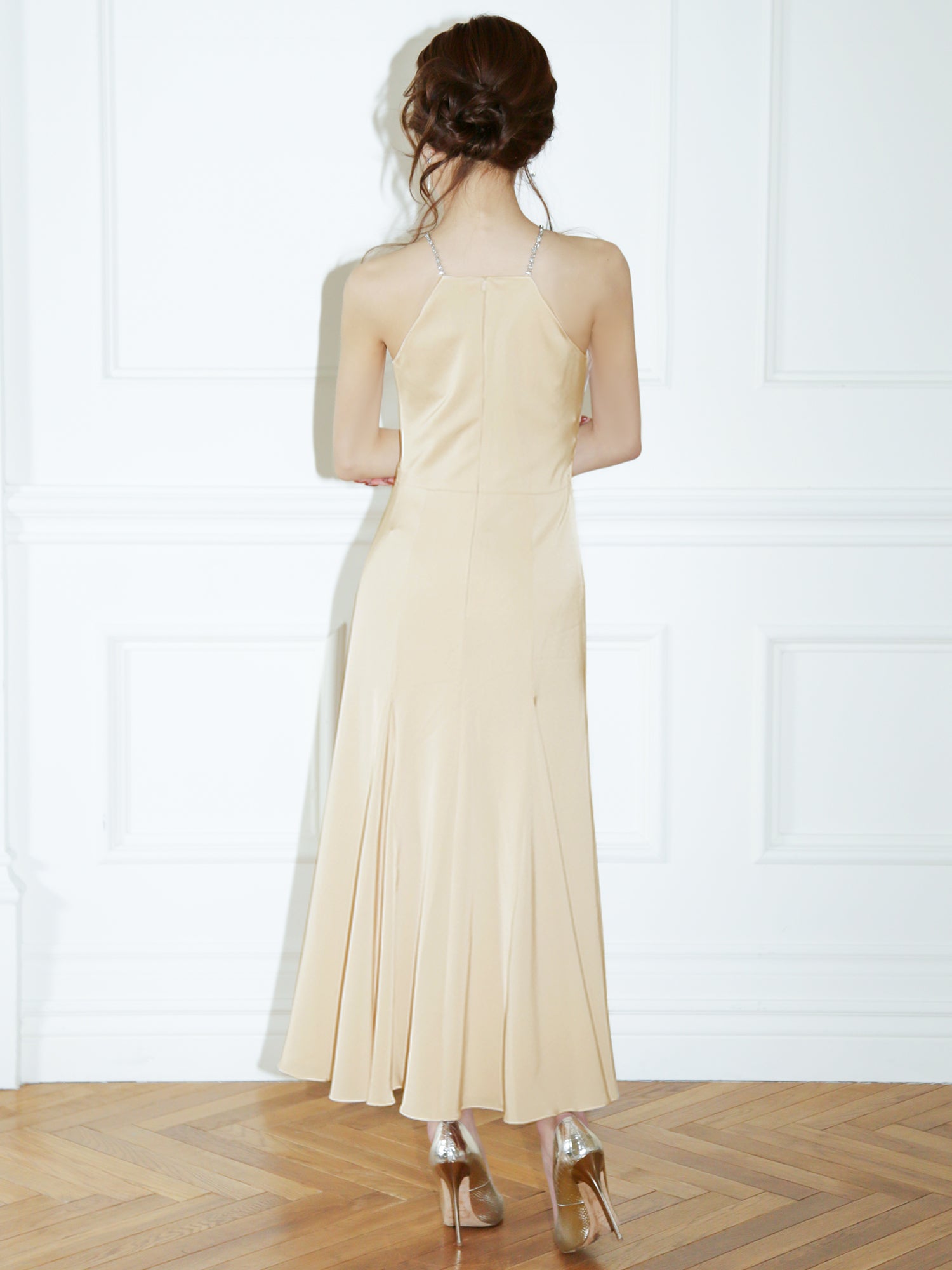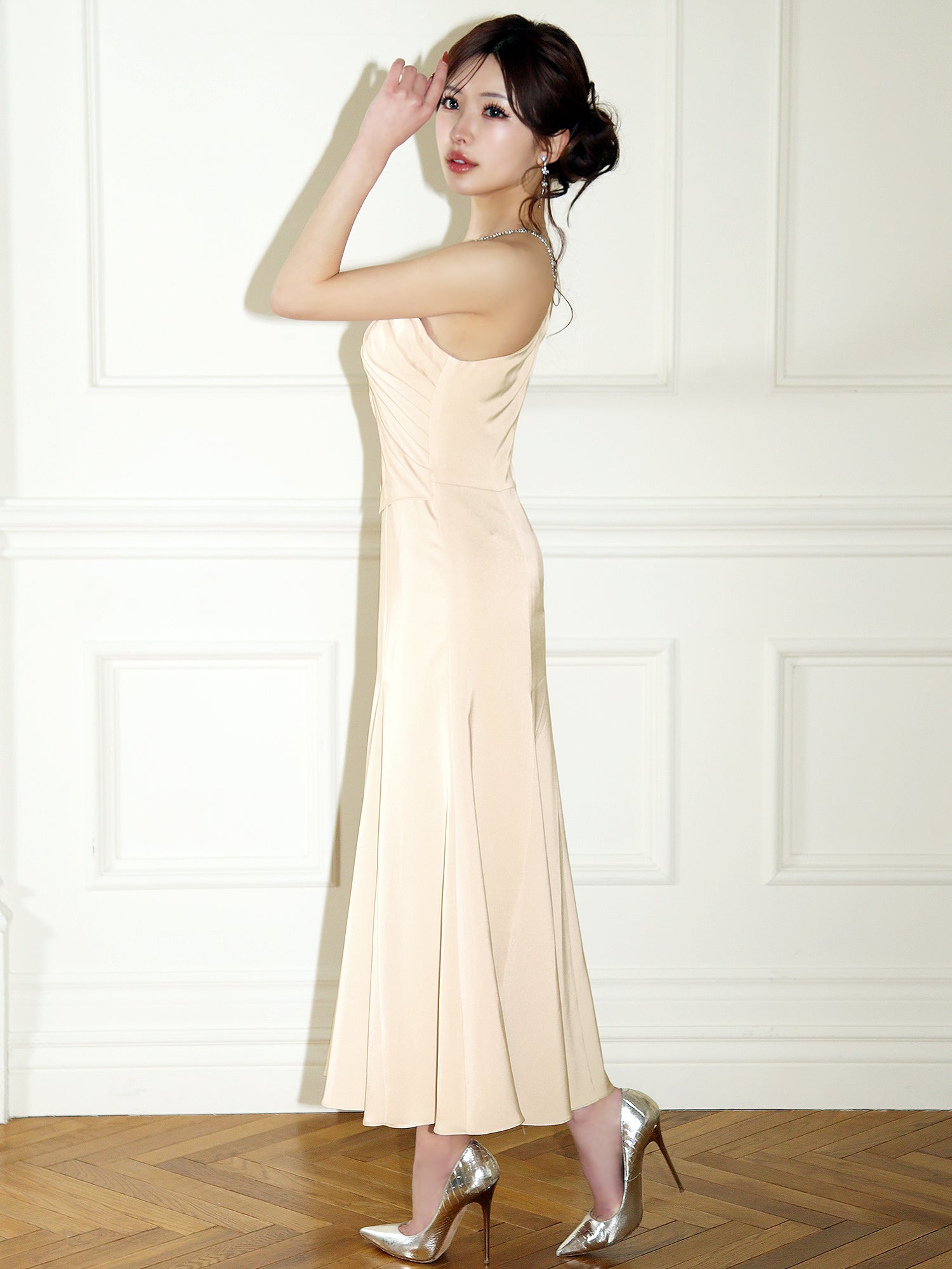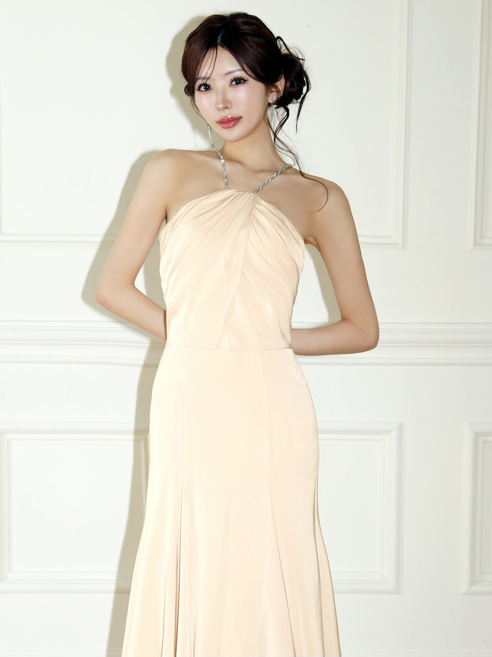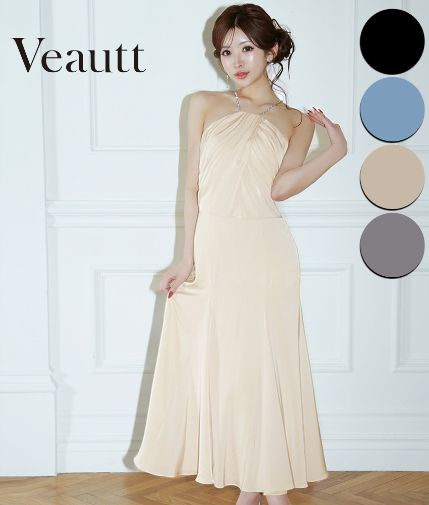 [ XS-Mサイズ / 4カラー ][Veautt]ホルターネック・ビジューチェーン・ドレープフレア・ミディアムドレス《送料&代引き手数料無料》