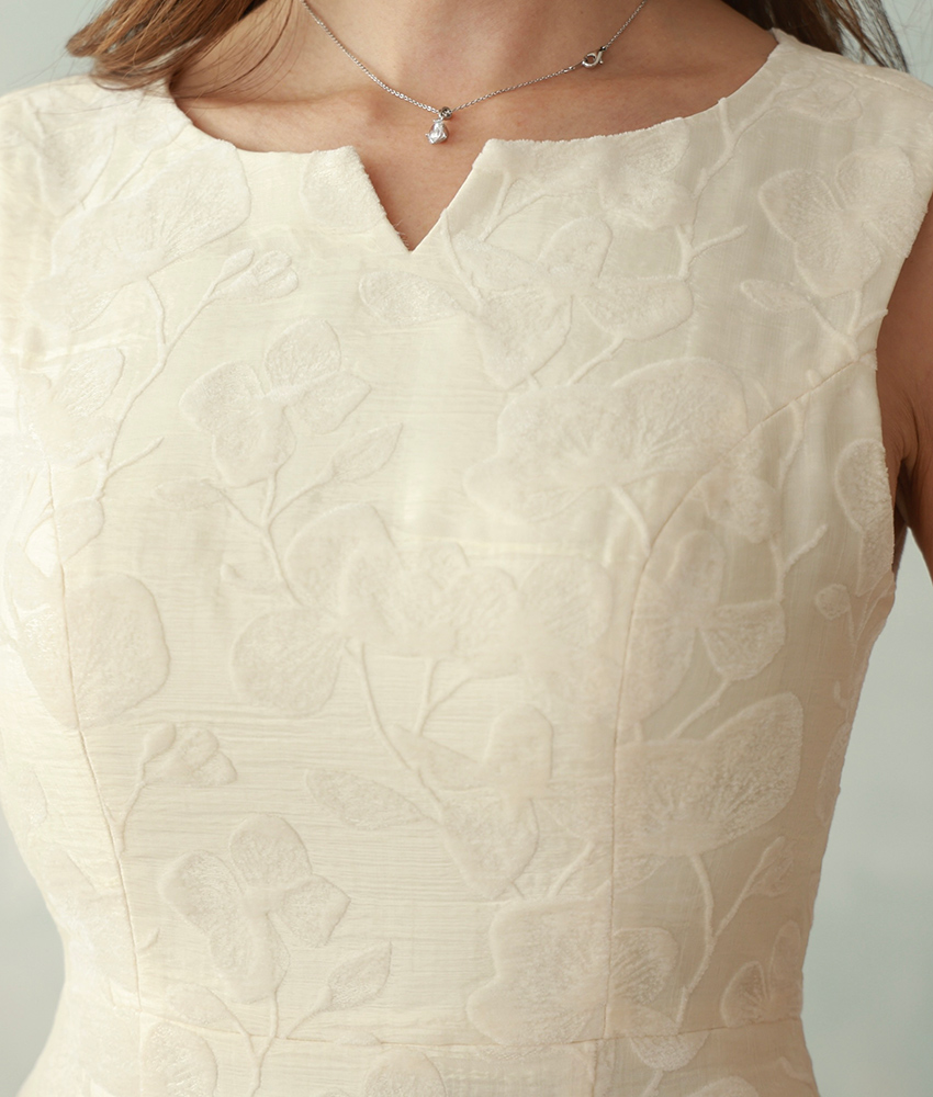 [韓国製][rinfarre]アイボリー・凹凸ジャガード調・Aライン・ノースリーブ・アメスリ・胸元カット・メタルバー・ミディアムドレス・ワンピース[薗田杏奈着用][送料無料] [cd-k06184im]