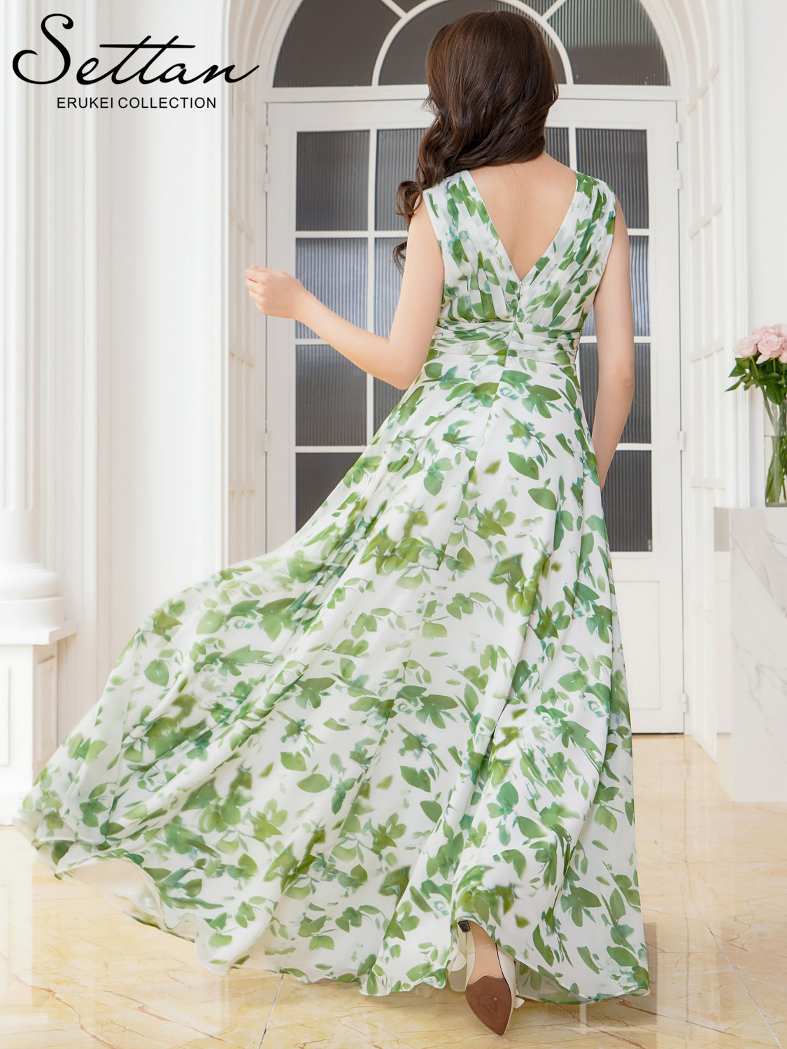 [ XS-Lサイズ / 1カラー][SETTAN]リーフ柄・プリント・シフォン・Vネック・ノースリーブ・Aライン・ロングドレス[送料無料] [lk-s37906]